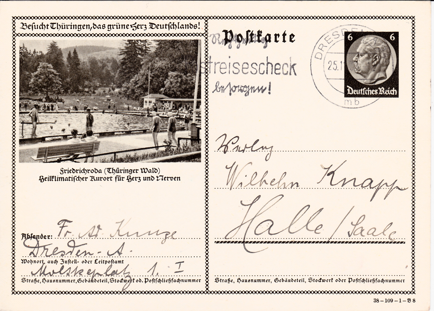 Friedrichroda (Thüringer Wald) zeigt auf dieser Bildpostkarte 1938 (Serie 109 Bild 8) sein Freibad.