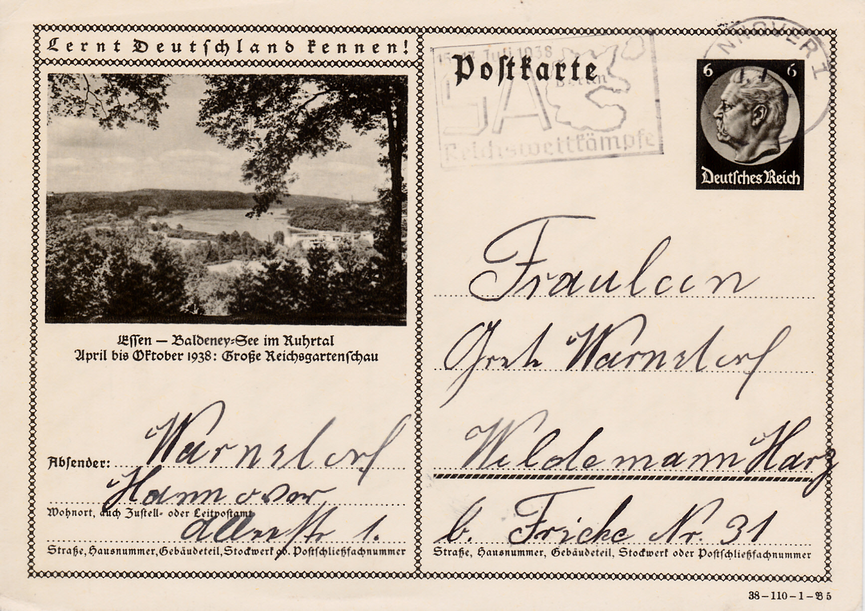 Auf dieser Karte (Serie 110 Bild 5) zeigt Essen den Baldeneysee und wirbt für die Reichsgartenschau 1938