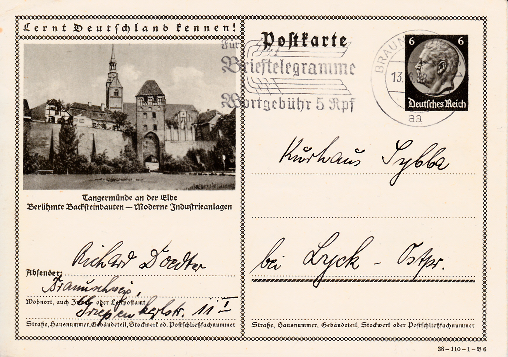 Tangermünde an der Elbe wirbt auf dieser Karte (Serie 110 Bild 6) mit dem gleichen Bild wie 1937 für den Besuch der mittelalterlichen Stadt mit seinen Backsteinbauten und seiner Burganlage.