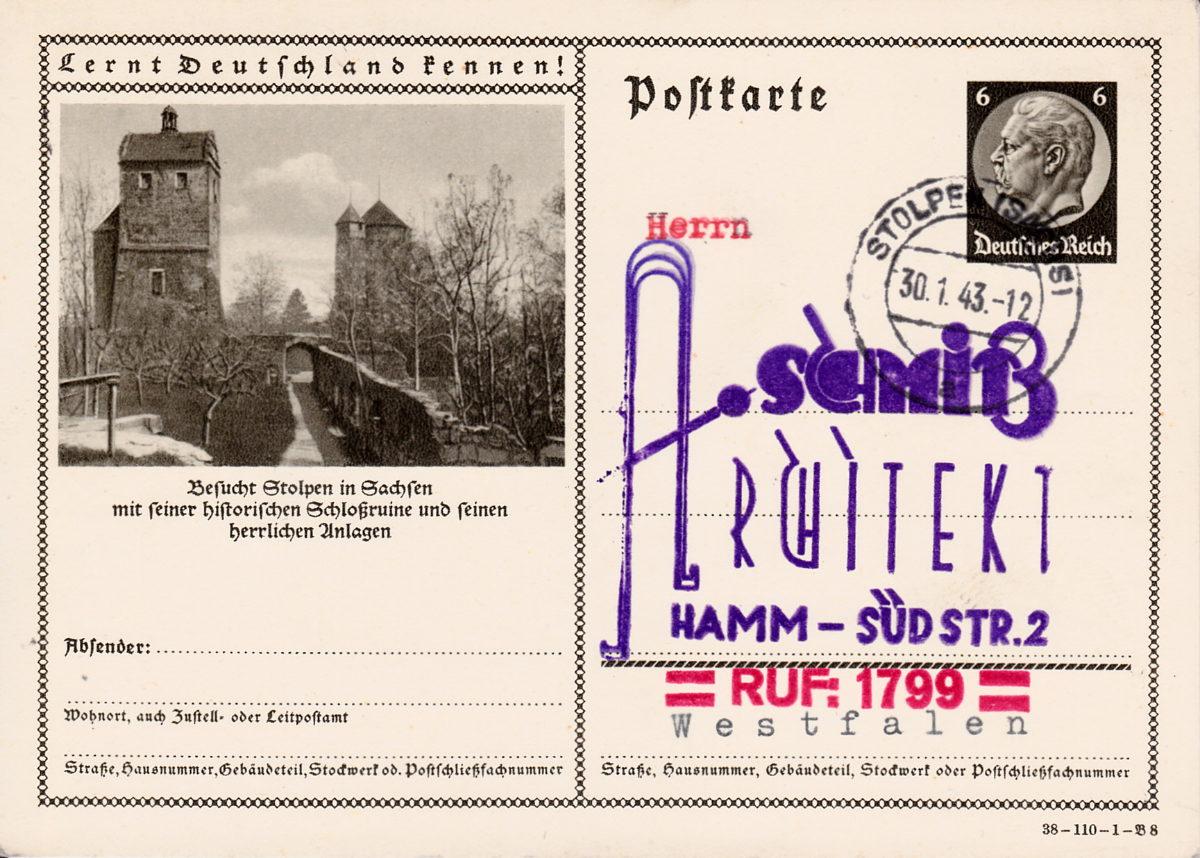 Stolpen in Sachsen zeigt auf dieser Bildpostkarte 1938 (Serie 110 Bild 8) erneut die Burgruine Schloss Stolpen. Die gezeigte Karte ist auch in Stolpen gestempelt worden.