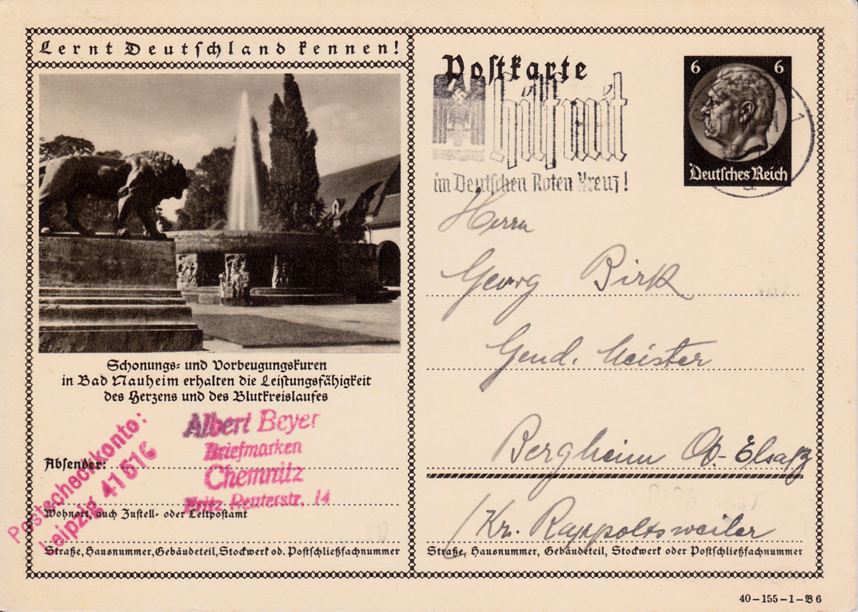 Bad Nauheim hatte 1940 auch noch eine Karte (Serie 155 Bild 7) mit dem Brunnen aus einer anderen Perspektive.