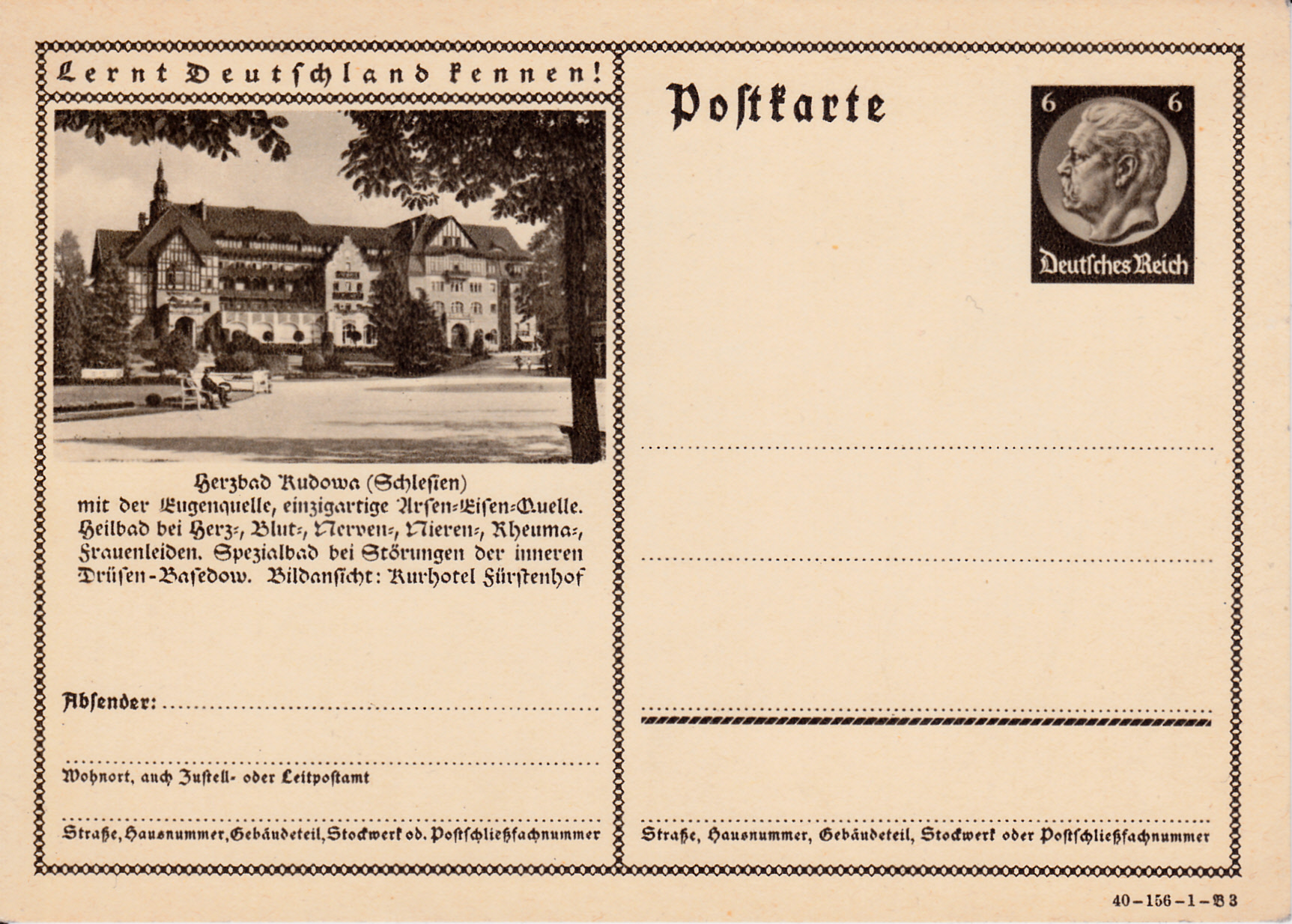 Bad Kudowa zeigt auf dieser Bildpostkarte (Serie 156 Bild 3) wieder ein Foto mit dem Kurhotel "Fürstenhof". Bad Kudowa heißt heute Kudowa-Zdrój und ist ein Kurort im Powiat Kłodzki in der Woiwodschaft Niederschlesien in Polen. Es ist eines der ältesten Heilbäder des Glatzer Landes und Niederschlesiens.