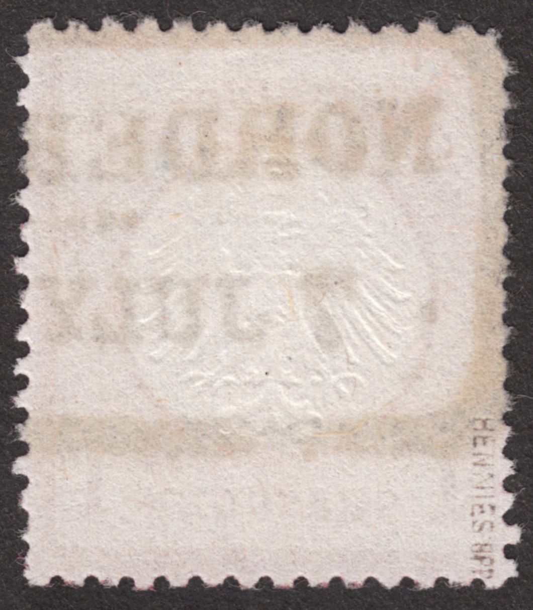 Die Marke zeigt den Plattenfehler MiNr. 19 XXIII a "Akzent über "C" in "REICHS-" auf der 1. Strichleiste" in Kombination mit einer bisher nicht im Handbuch aufgeführten Druckbesonderheit in Form eines Farbflecks rechts am Rand zwischen der 8. und 9. Strichleiste: