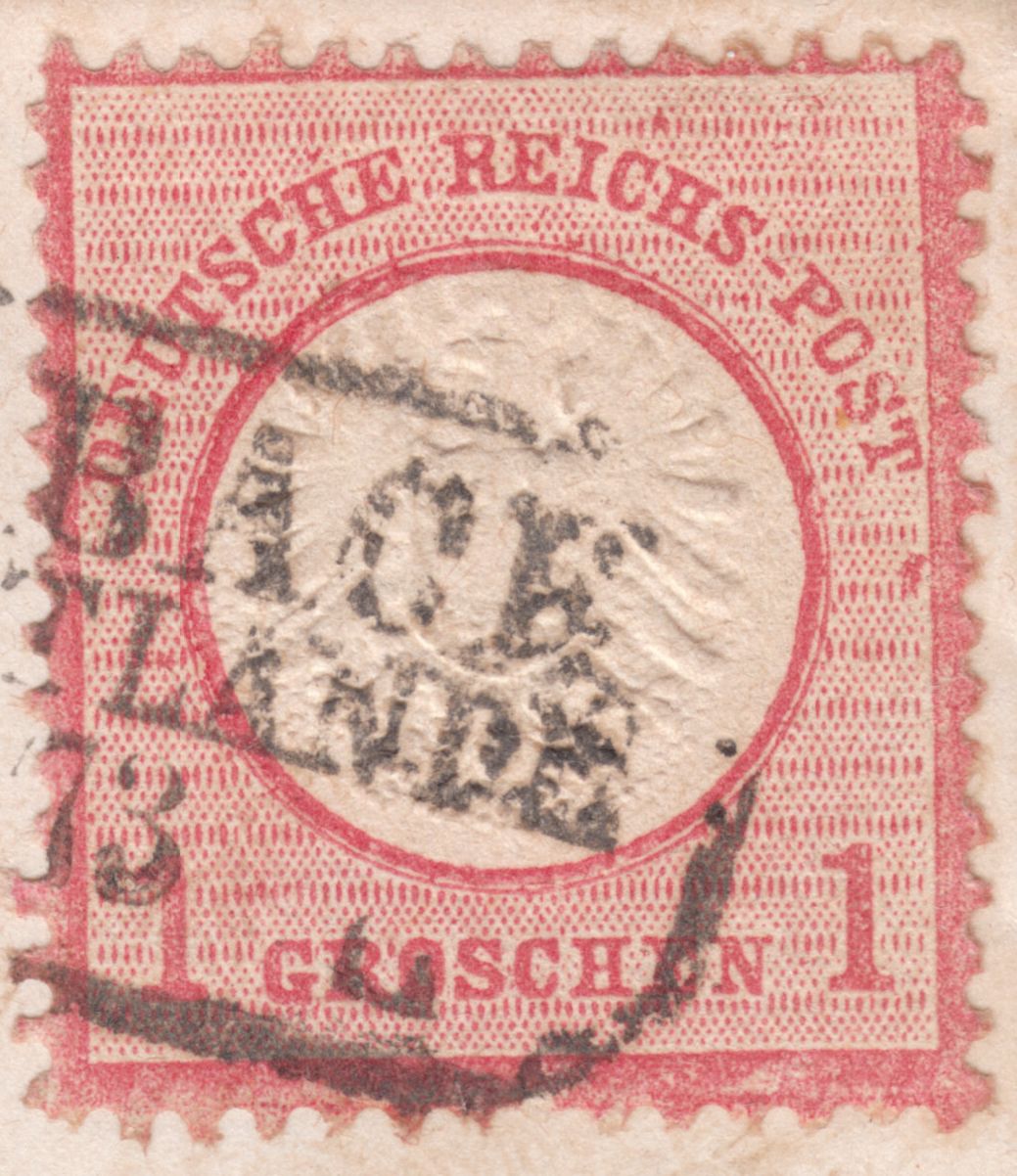 Die Entwertung erfolgte am 24.05.1875 per nachverwendetem dreizeiligem Rechteckstempel "OLDENDORF REG. BEZ. CASSEL", Feuser NDP 755.