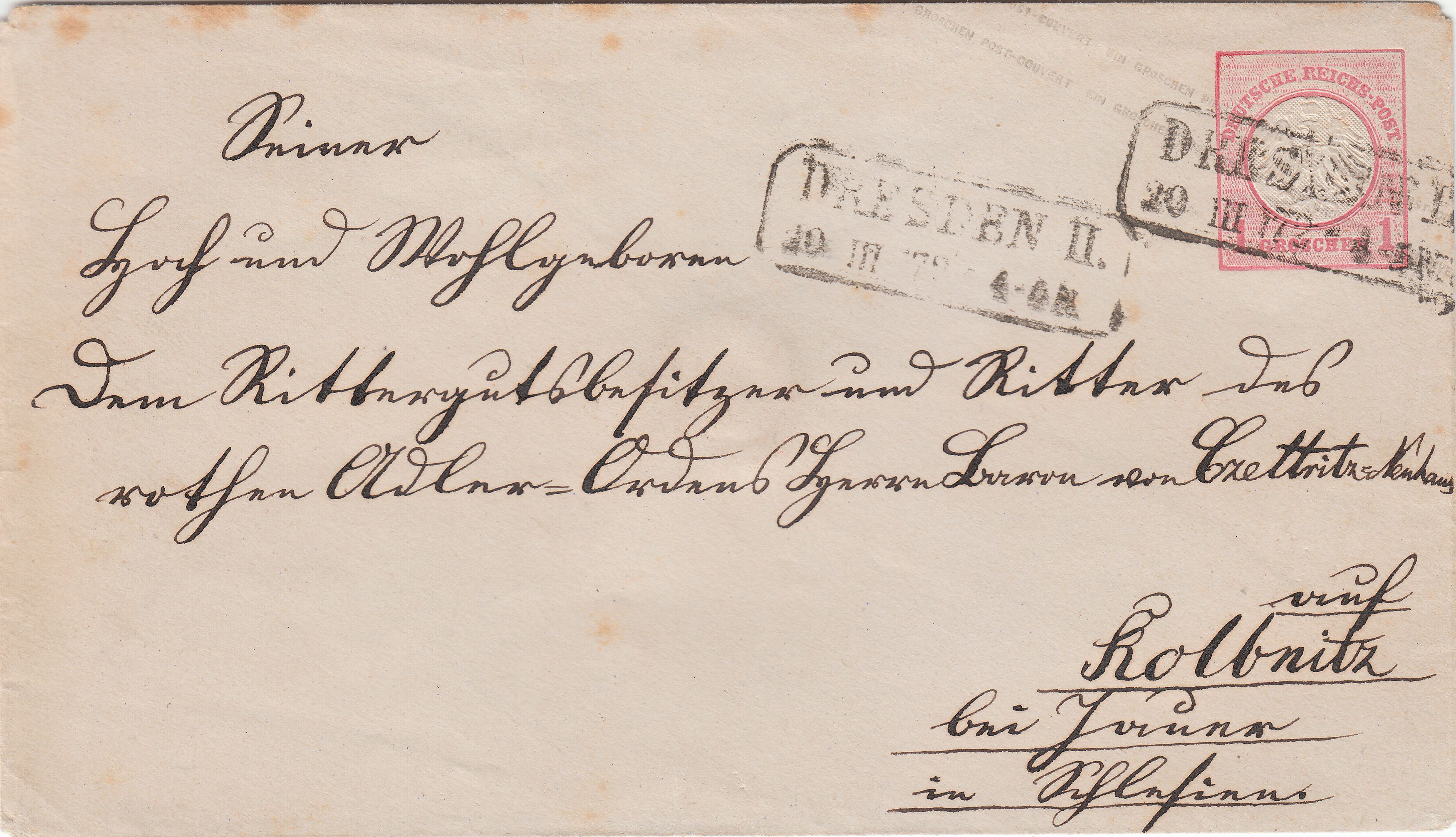 Hier eine Ganzsache MiNr. U1 I A, entwertet am 20.03.1872 per nachverwendetem Sachsen-Achteckstempel "DRESDEN II.", adressiert an "Seiner Hoch und Wohlgeeboren dem Rittergutsbesitzer und Ritter des rothen Adler-Ordens Herrn Baron von Czettritz-Neuhaus auf Kolbnitz bei Jauer in Schlesien":