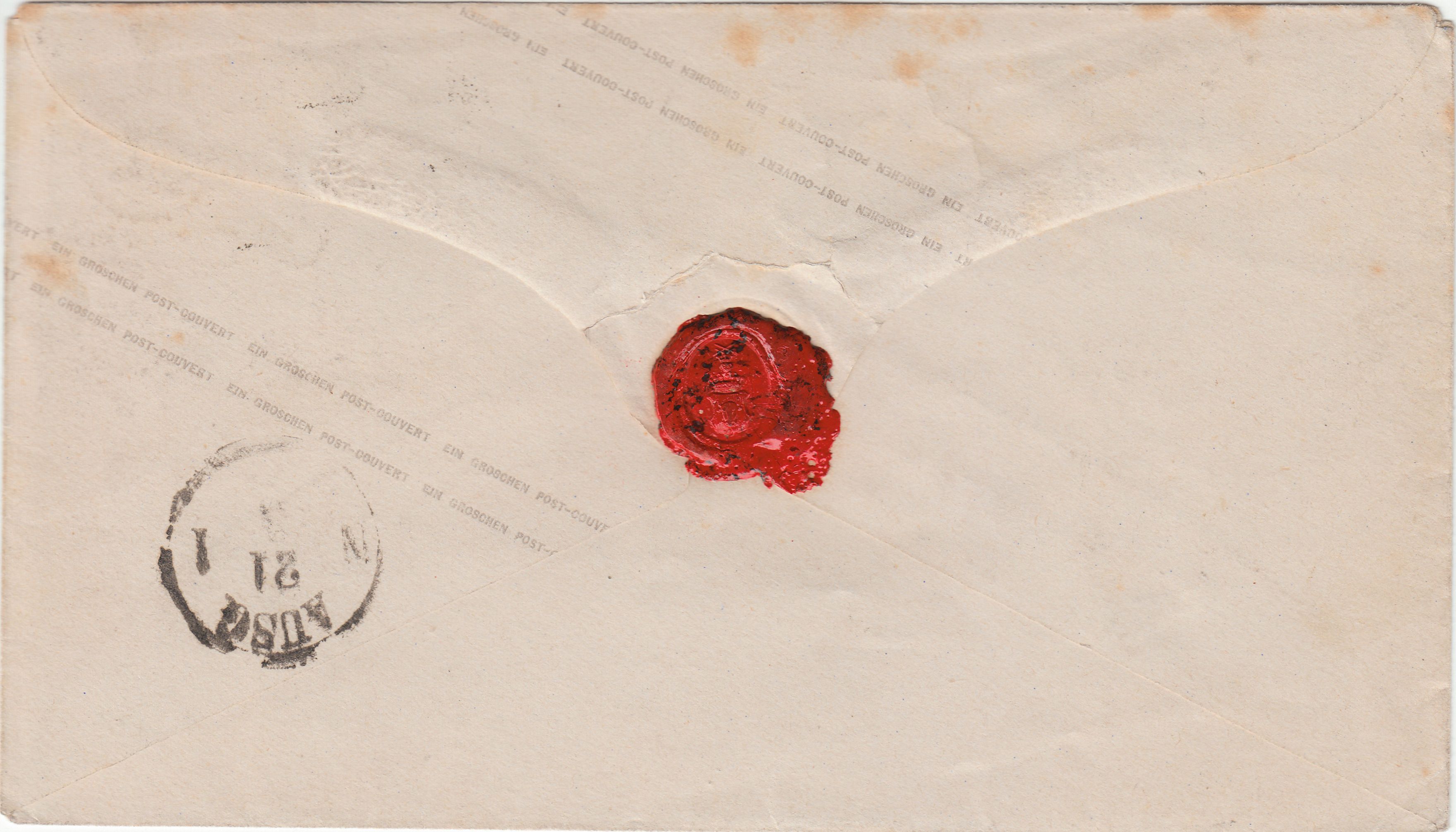 Als Aufgabestempel diente ein nachverwendeter dreizeiliger NDP-Rechteckstempel "HAMBURG P. E. 7 PÖSELDORF", Feuser NDP 431.