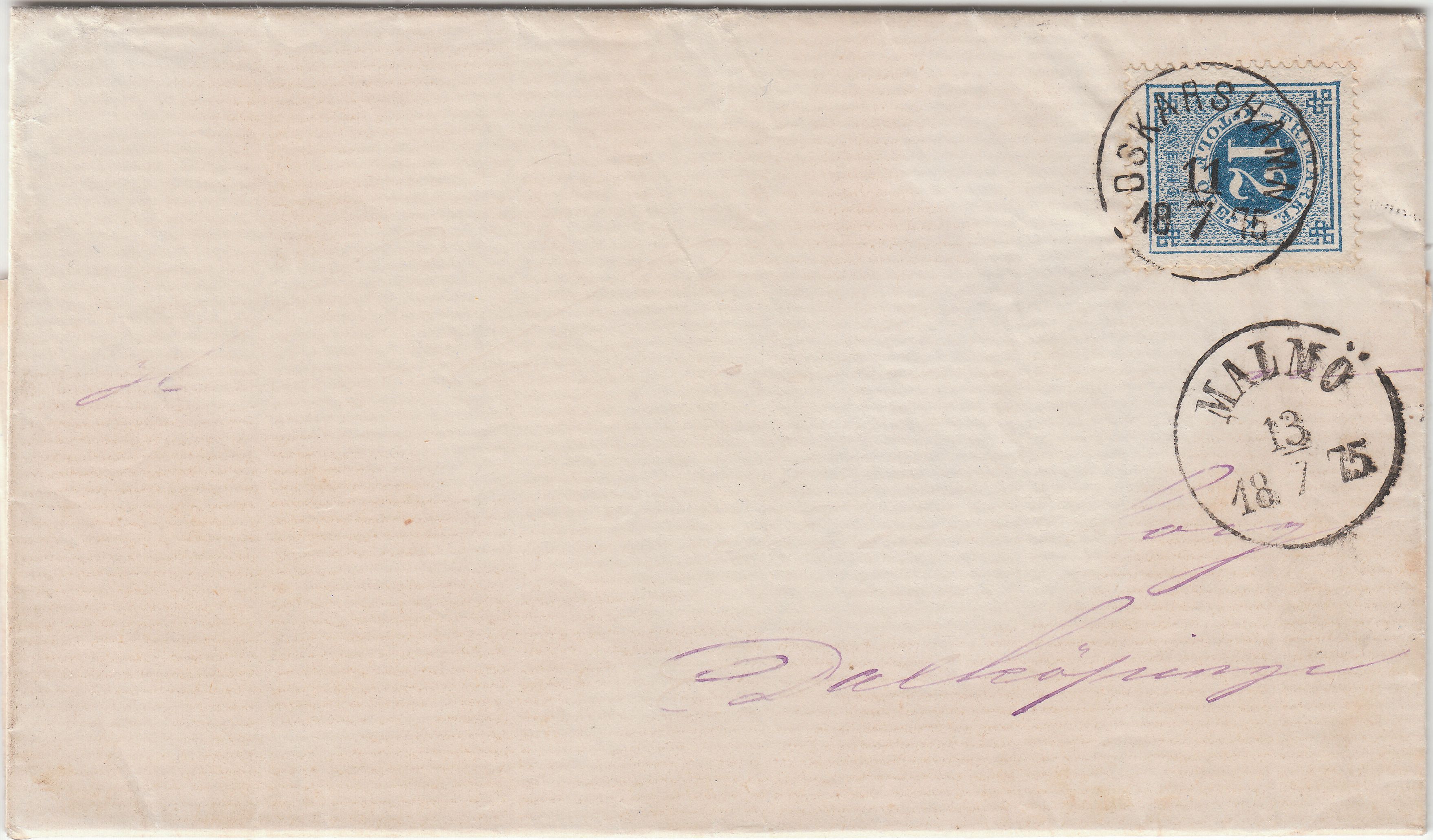 Hier die Wertstufe 12 Öre als Einzelfrankatur auf einem am 11.07.1875 in OSKARSHAMN aufgegebenen Brief, der am 13.07.1875 in MALMÖ ankam: