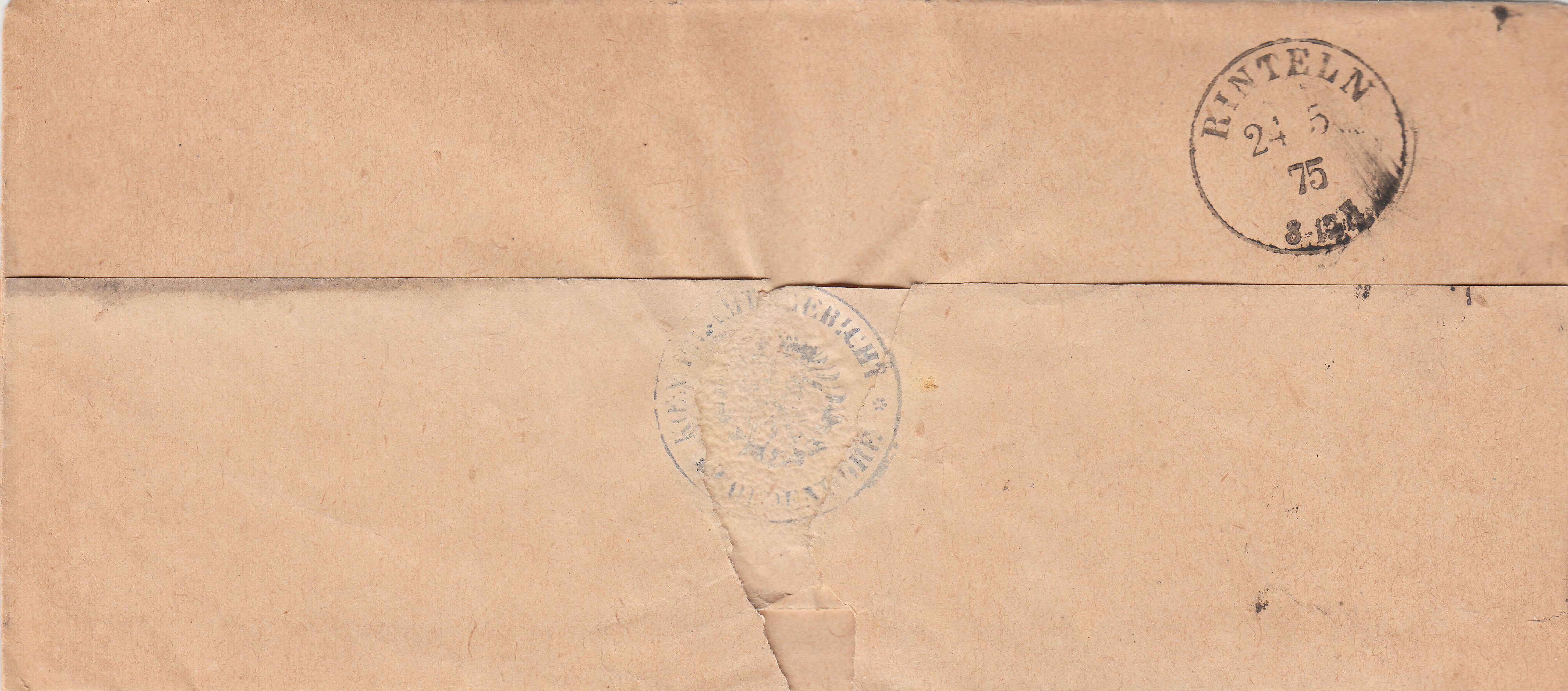 Rückseitig wurde als Ankunftstemel noch am Abend des 24.05.1875 = "8-12 N" ein Kreisstempel RINTELN abgeschlagen.