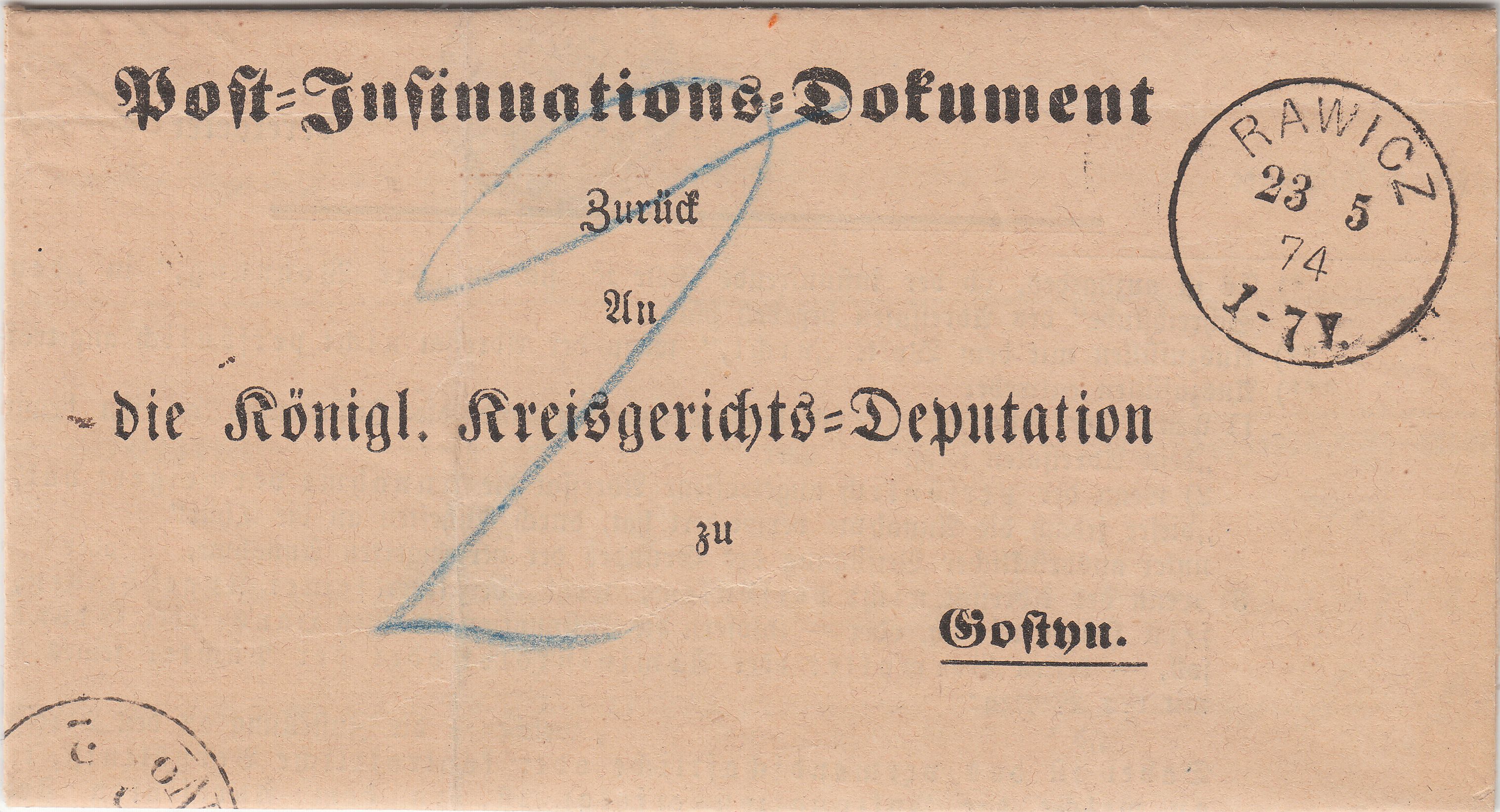 In diesem Angebot bei ebay gab es für 3,05 € inklusive Porto ein Post-Insinuations-Dokument, gelaufen am 23.05.1874 von RAWICZ nach Gostyn: