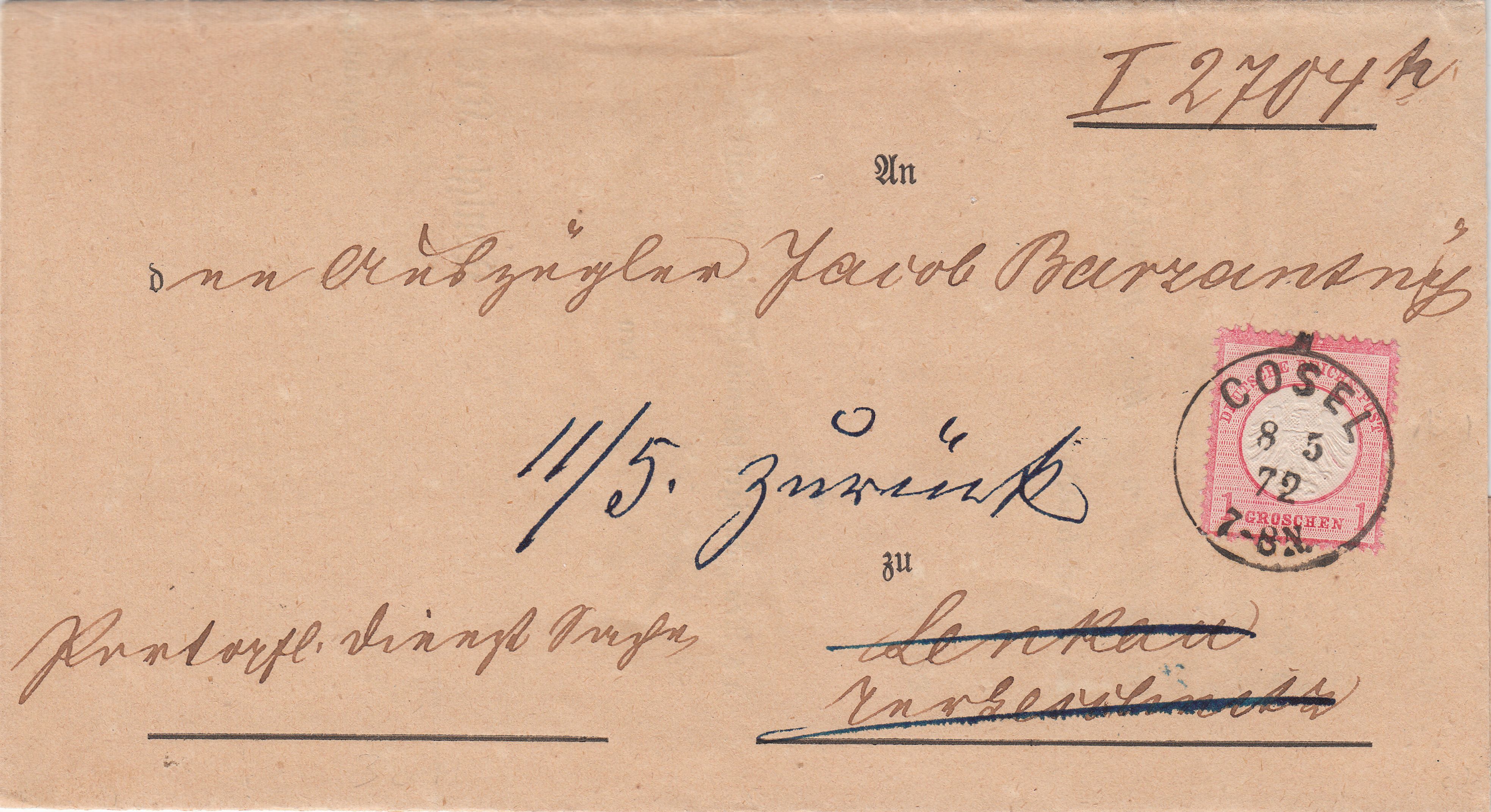Hier eine Einzelfrankatur der MiNr. 4 am 08.05.1872 auf portopflichtiger Dienstsache mit Kreisstempel "COSEL", adressiert "An den Auszügler Jacob Barzantny in Lenkau":