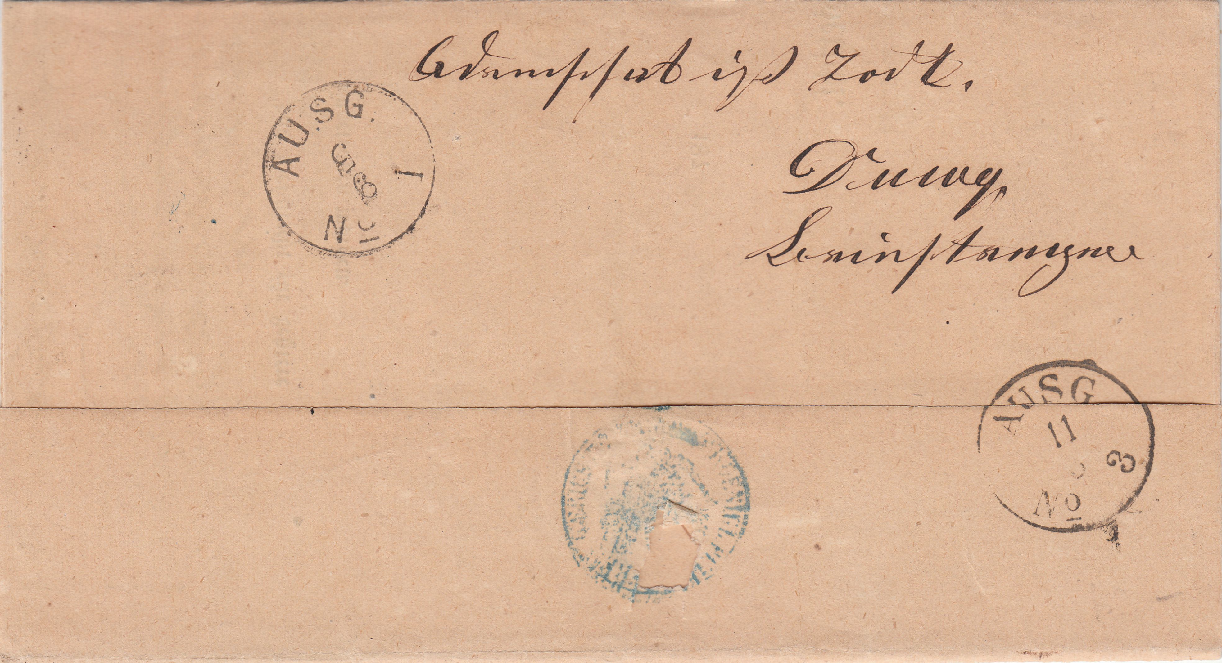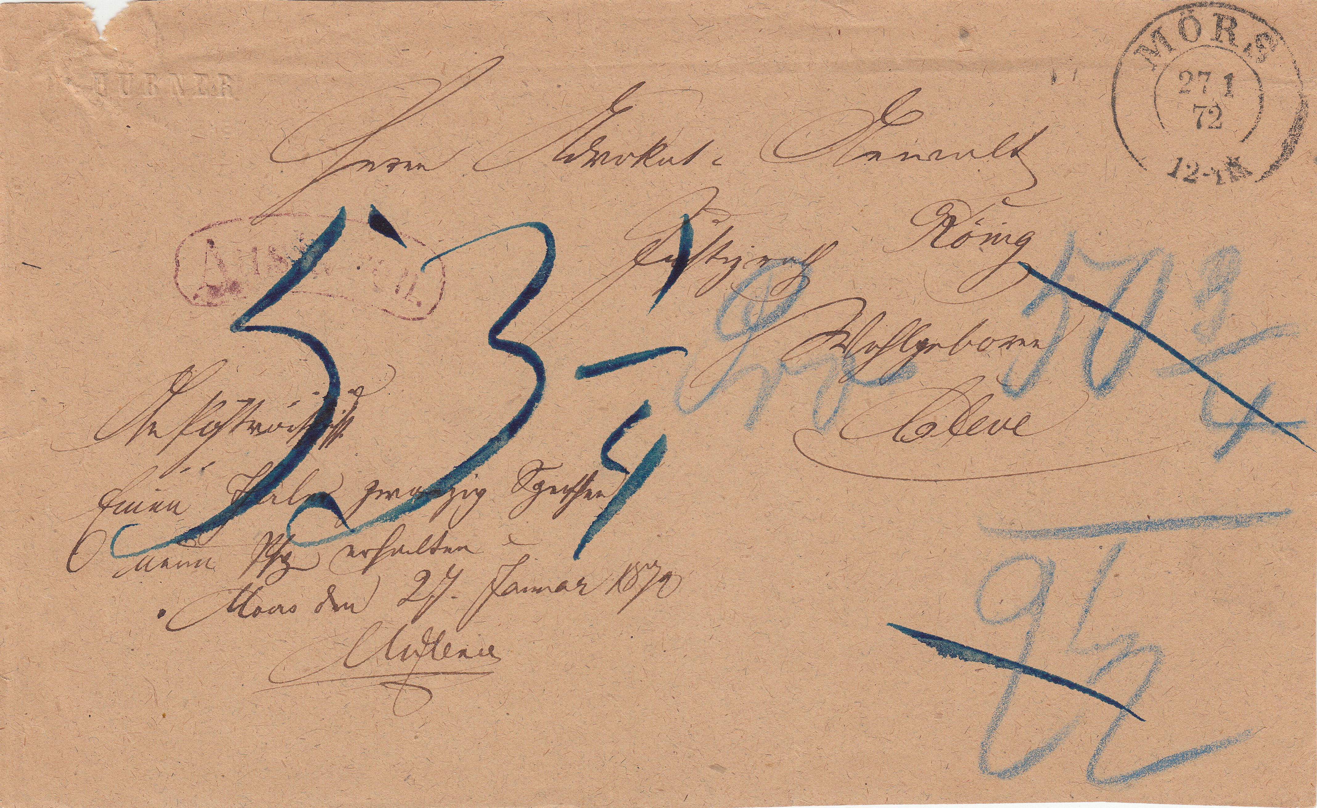 Der Empfänger "Herrn Advokat Anwalt Justizrath König Wohlgeboren Cleve" mußte bei der Zustellung dieses Briefes dementsprechend "53 1/4" Groschen zahlen.