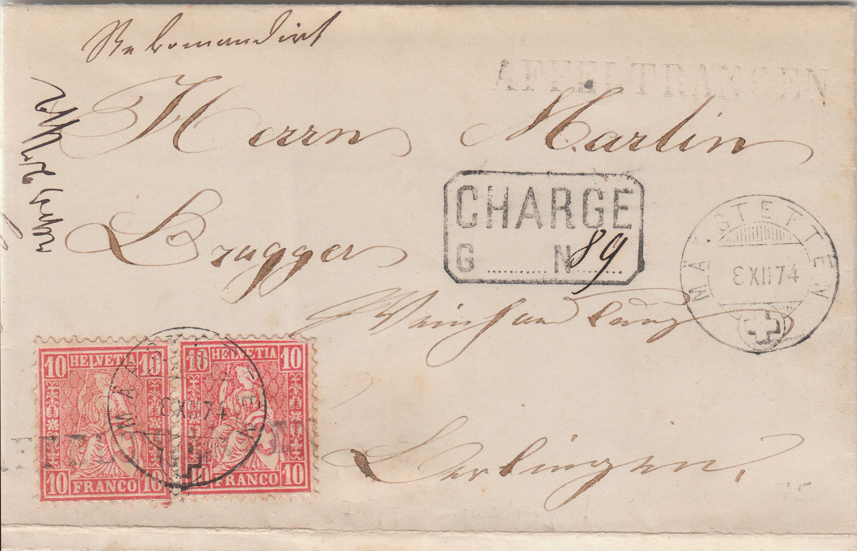 Die Entwertung erfolgte gleich doppelt, zunächst per Langstempel "AFFELTRANGEN" und dann am 08.12.1874 per Tagesstempel "MÄRSTETTEN". Am 09.12.1874 kam der Beleg an seinem Bestimmungsort "BERLINGEN" an. Ein Brief bis 15 Gramm kostete seit 01.09.1871 im Fernverkehr 10 Rappen, die Einschreibegebühr betrug seit 01.09.1871 ebenfalls 10 Rappen.