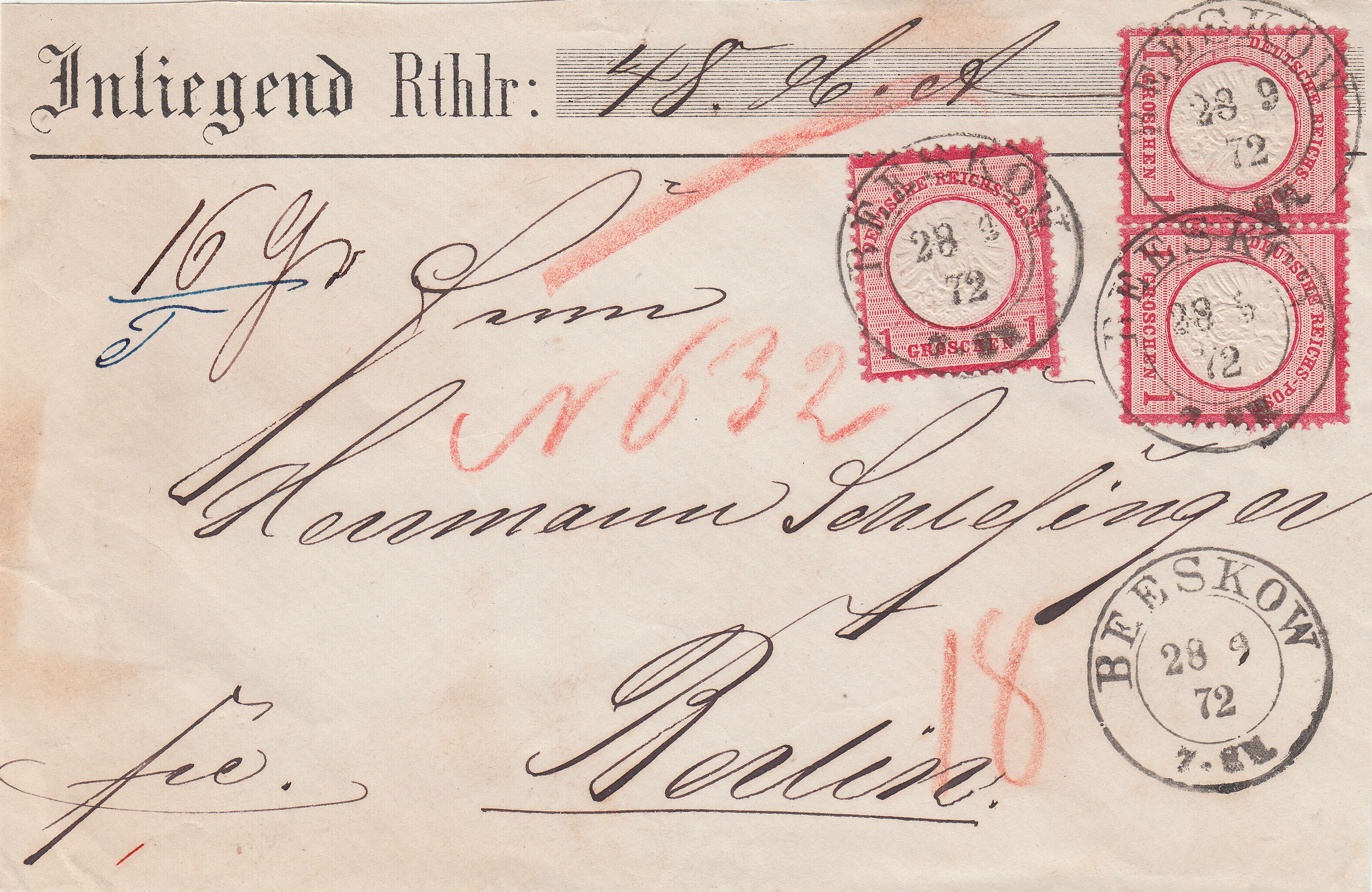 Hier eine Mehrfachfrankatur der MiNr. 19 in Form von einem Paar sowie einer Einzelmarke auf der Briefvorderseite eines nach Berlin adressierten Briefes mit Wertangabe "Inliegend Rthlr 48", aufgegeben am 28.09.1872 in BEESKOW:
