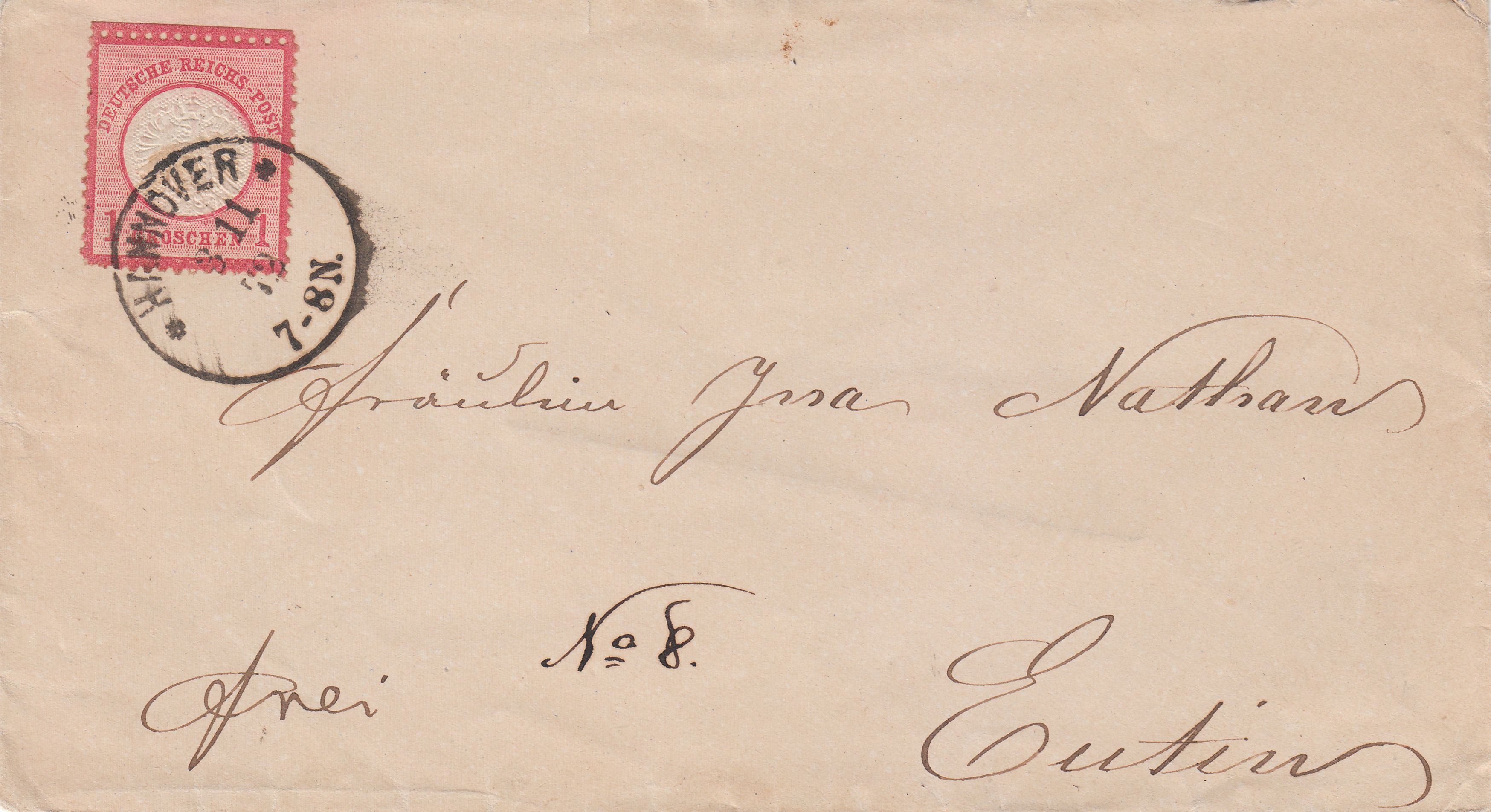 EF der MiNr. 19 am 03.11.1872 auf Brief von Hannover nach Eutin: