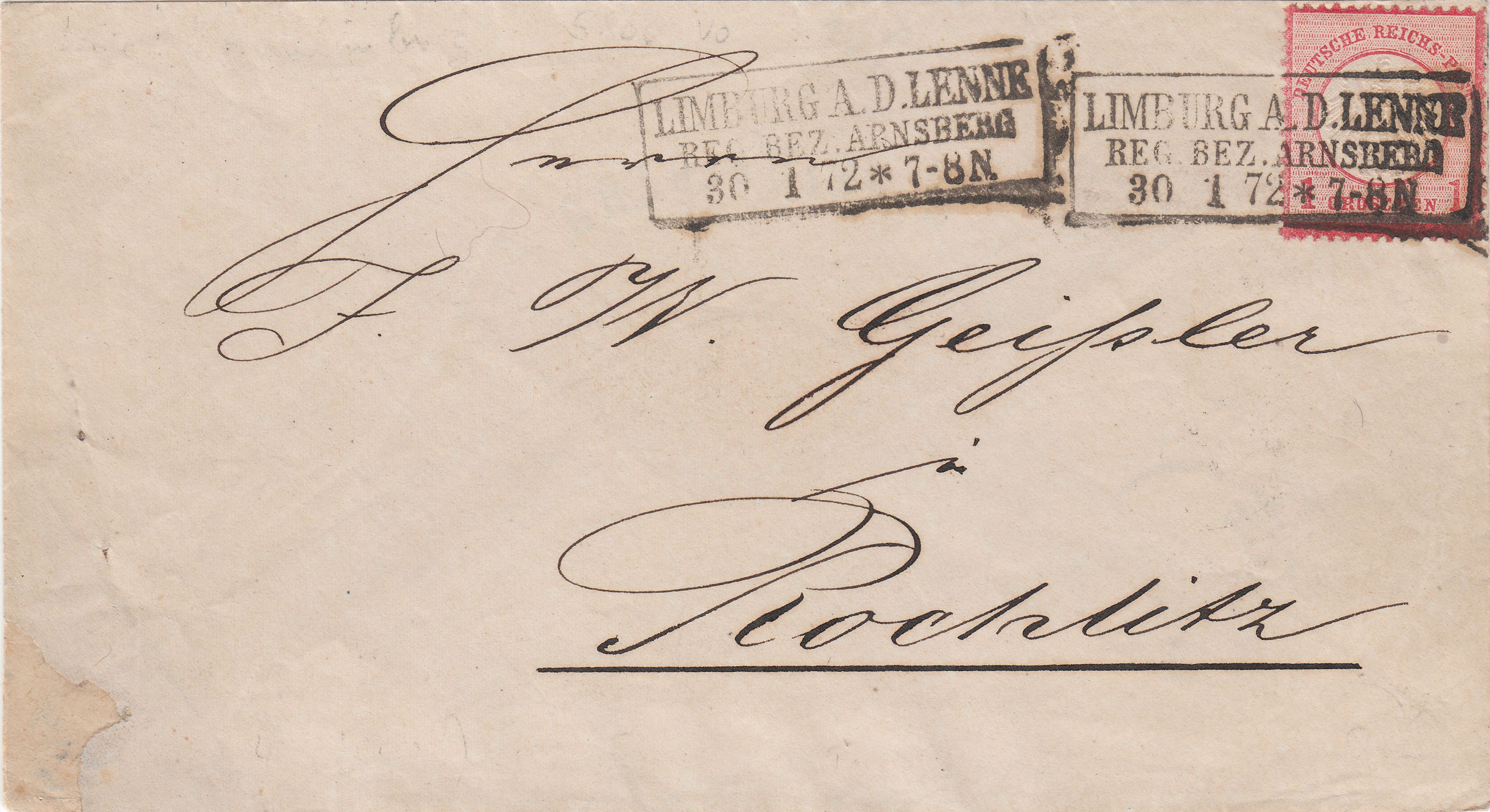 EF der MiNr. 4 auf Brief am 30.01.1872, also aus dem ersten Monat der Gültigkeit, adressiert nach "Rochlitz", entwertet per nachverwendetem preussischem dreizeiligem Rechteckstempel "LIMBURG A. D. LENNE REG. BEZ. ARNSBERG *", Feuser Pr 1945: