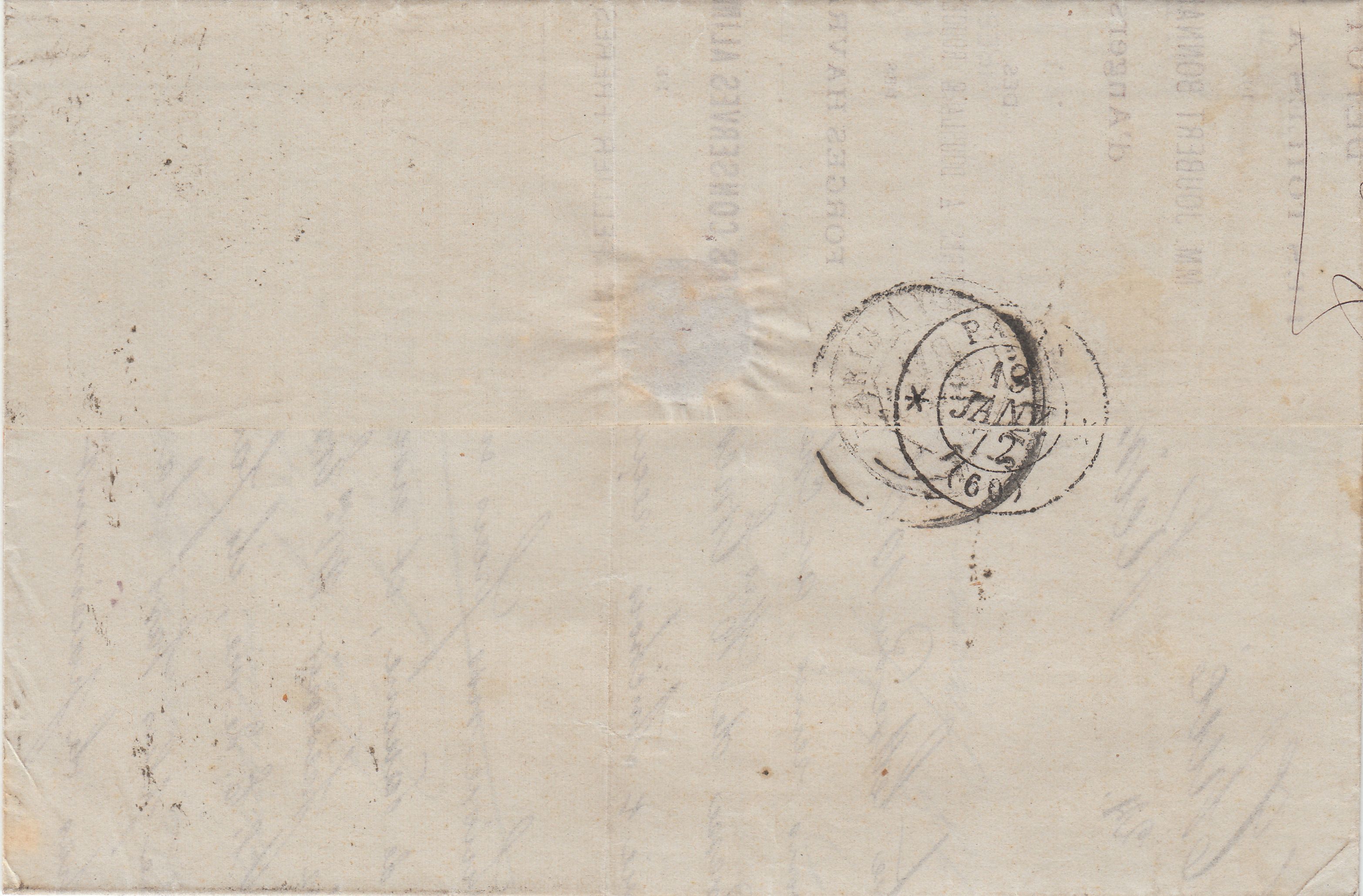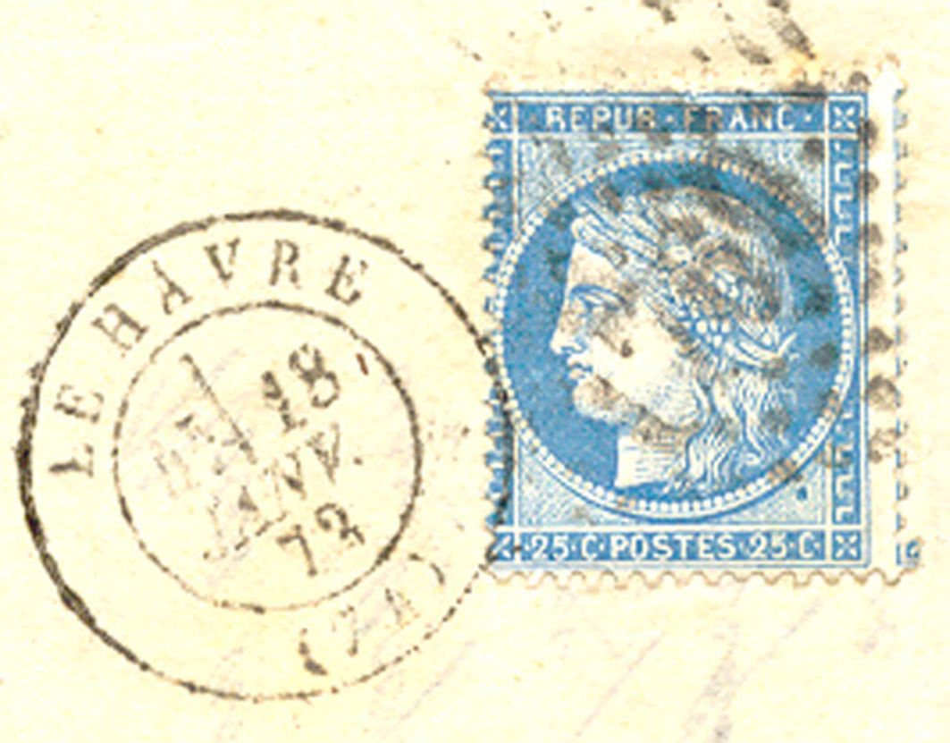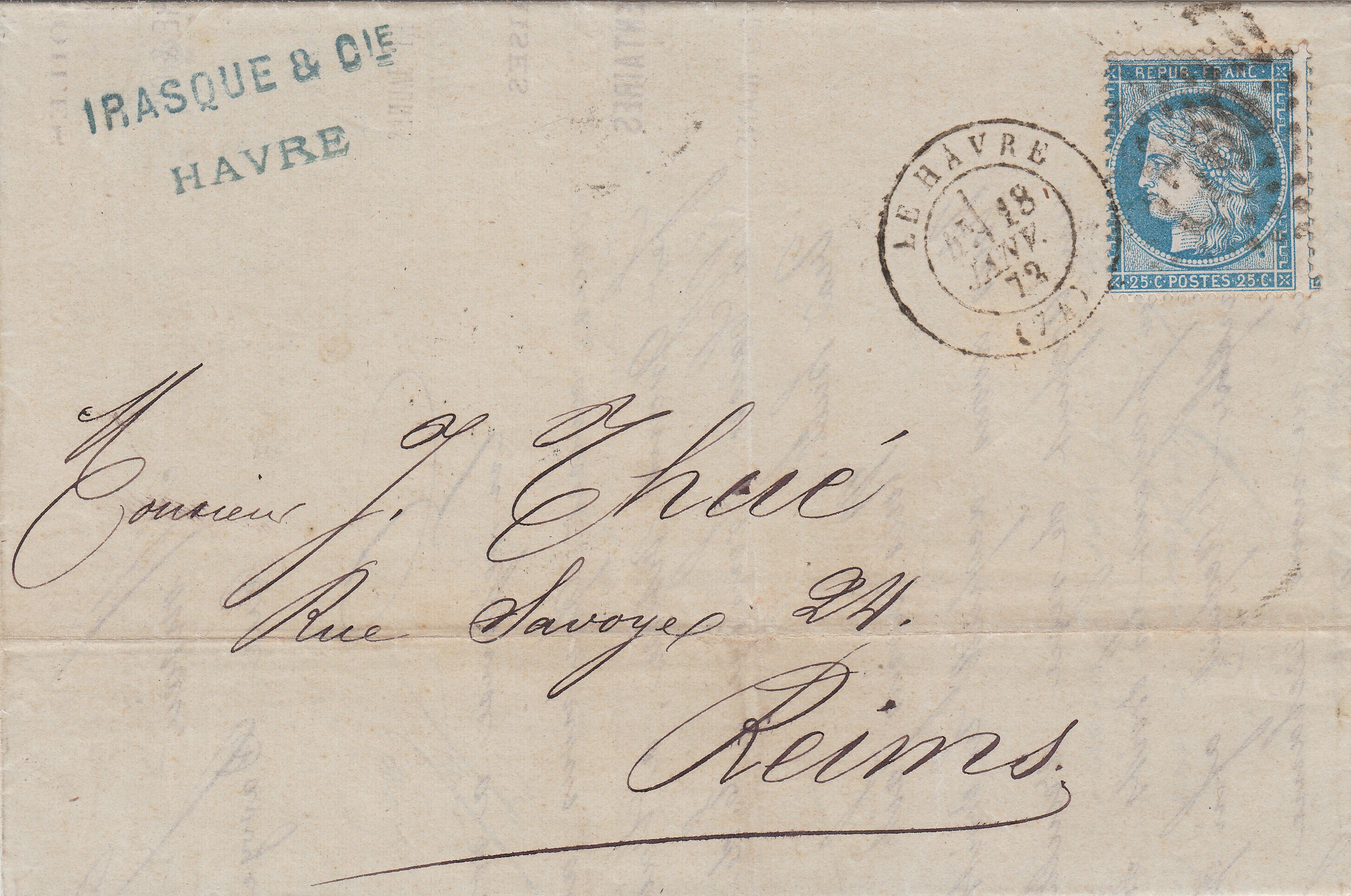 Hier ein Brief aus Frankreich, adressiert nach Reims, aufgegeben am 18.01.1872 in "LE HAVRE", also aus dem ersten Gültigkeitsmonat der Brustschildmarken stammend: