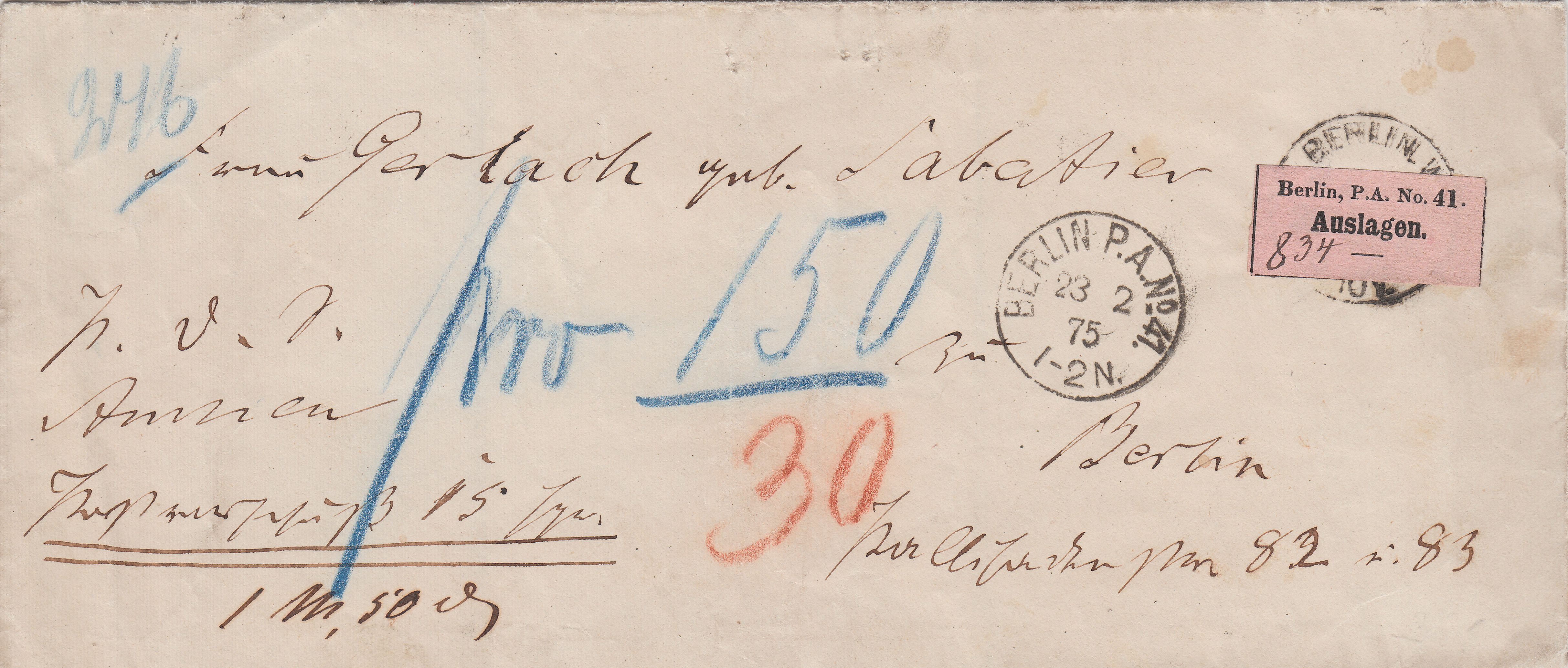 Dieser im Ortsverkehr Berlins gelaufene Brief wurde am 23.02.1875 mit einem Klebezettel "Berlin, P.A. No. 41. Auslagen."versehen: