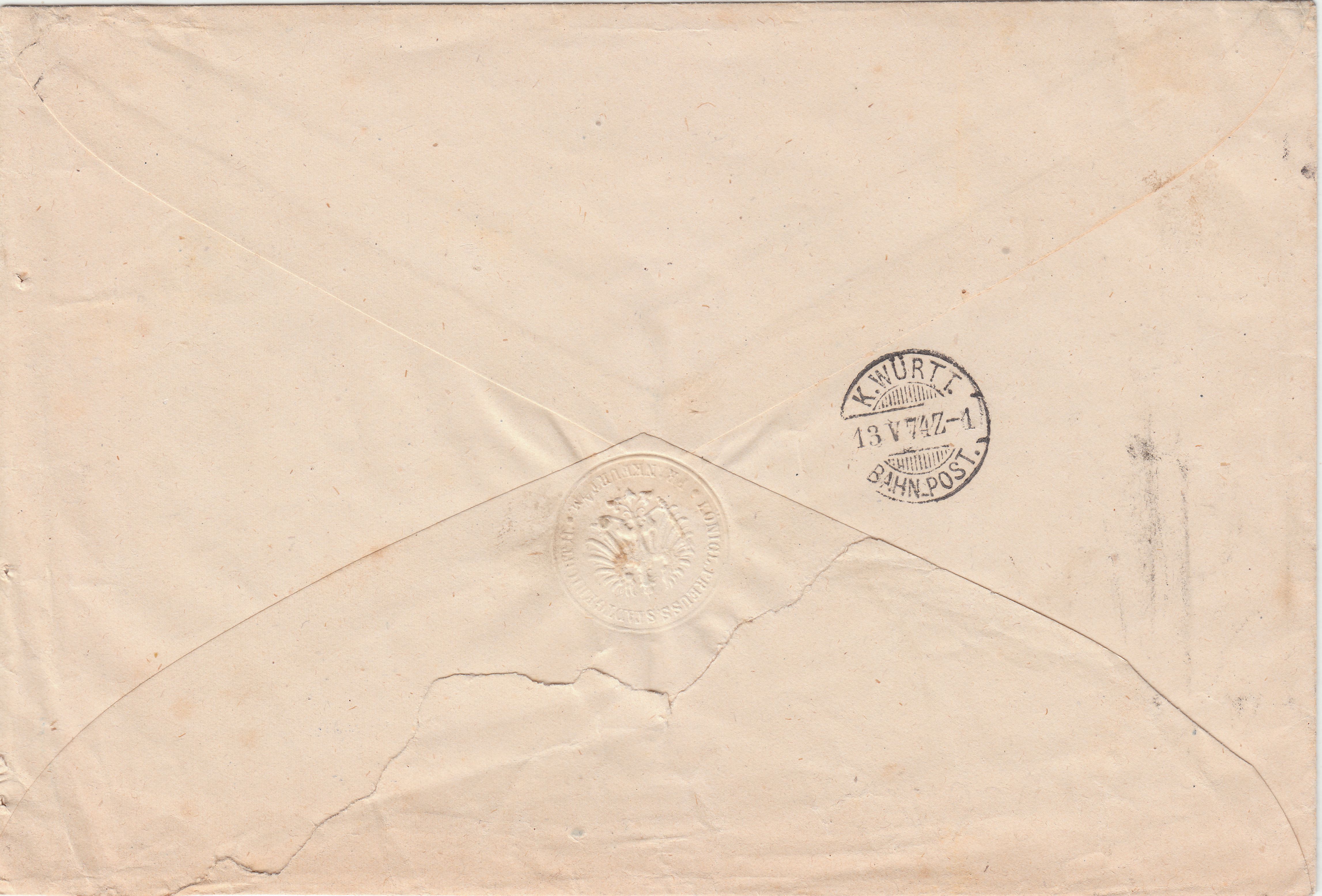 Der Beleg wurde am 13.04.1874 per württembergischer Bahnpost im "Z-1" = Zug 1, transportiert, was ein rückseitiger Durchgangsstempel dokumentiert.