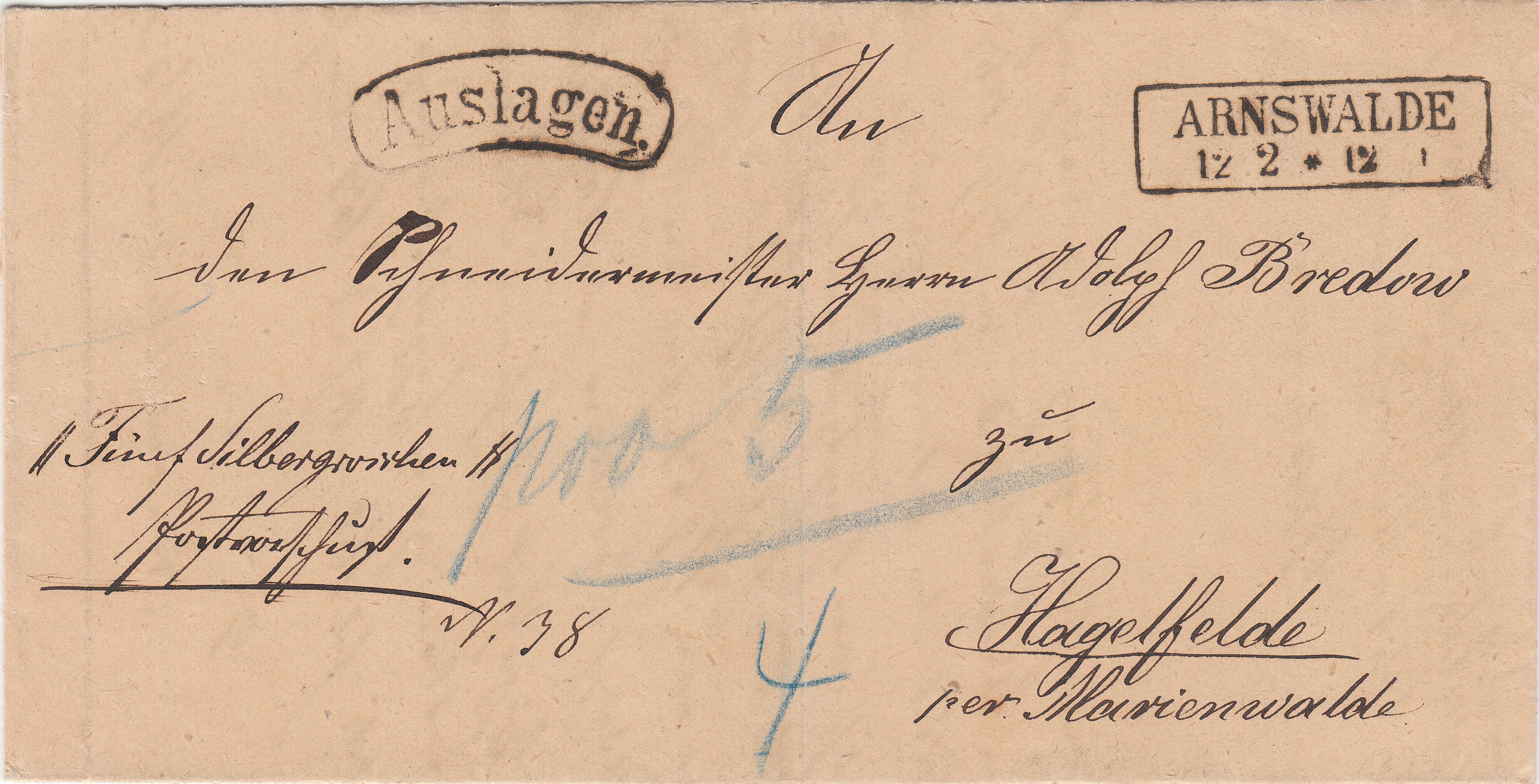 Hier ein Brief per Postvorschuß, adressiert nach "Hagelfelde per Marienwalde", aufgegeben am 12.02.1874 in ARNSWALDE: