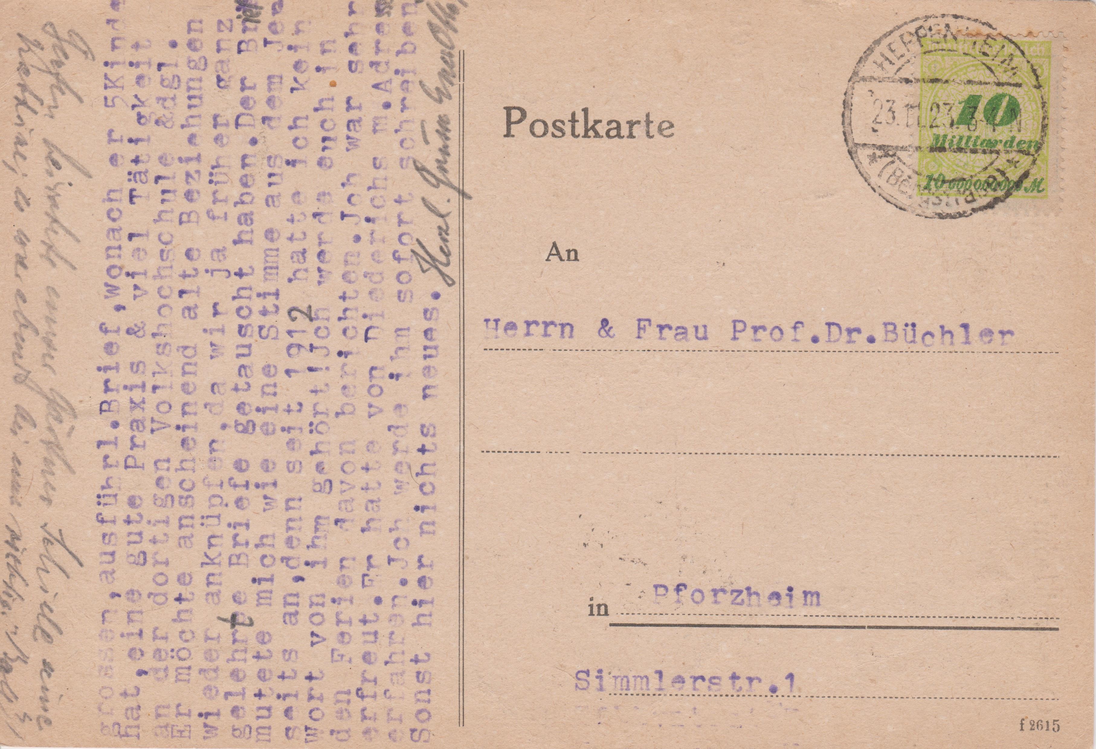 Während der kurzen Zeitspanne vom 20.11.1923 bis zum 25.11.1923, also ganze 6 Tage lang, galt für eine Postkarte im Fernverkehr die hier am 23.11.1923 nachmittags um "3-4 N" in HEPPENHEIM dargestellte Einzelfrankatur einer MiNr. 326 A P als Portostufe von 10 Milliarden Mark, adressiert nach Pforzheim: