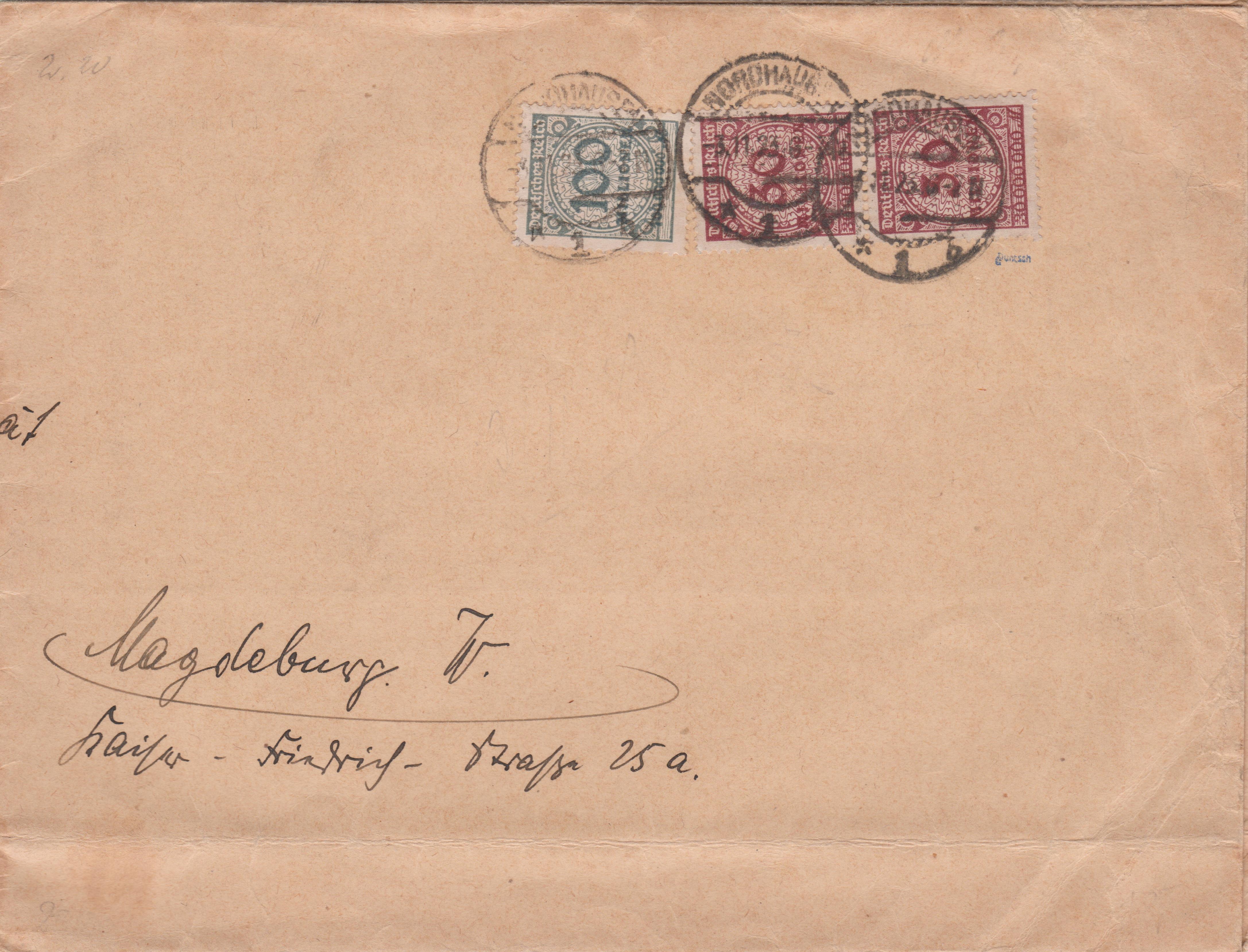 Großformatiger Brief, gelaufen im Fernverkehr von NORDHAUSEN nach Magdeburg, am 03.11.1923 freigemacht mit 160 Millionen Mark: