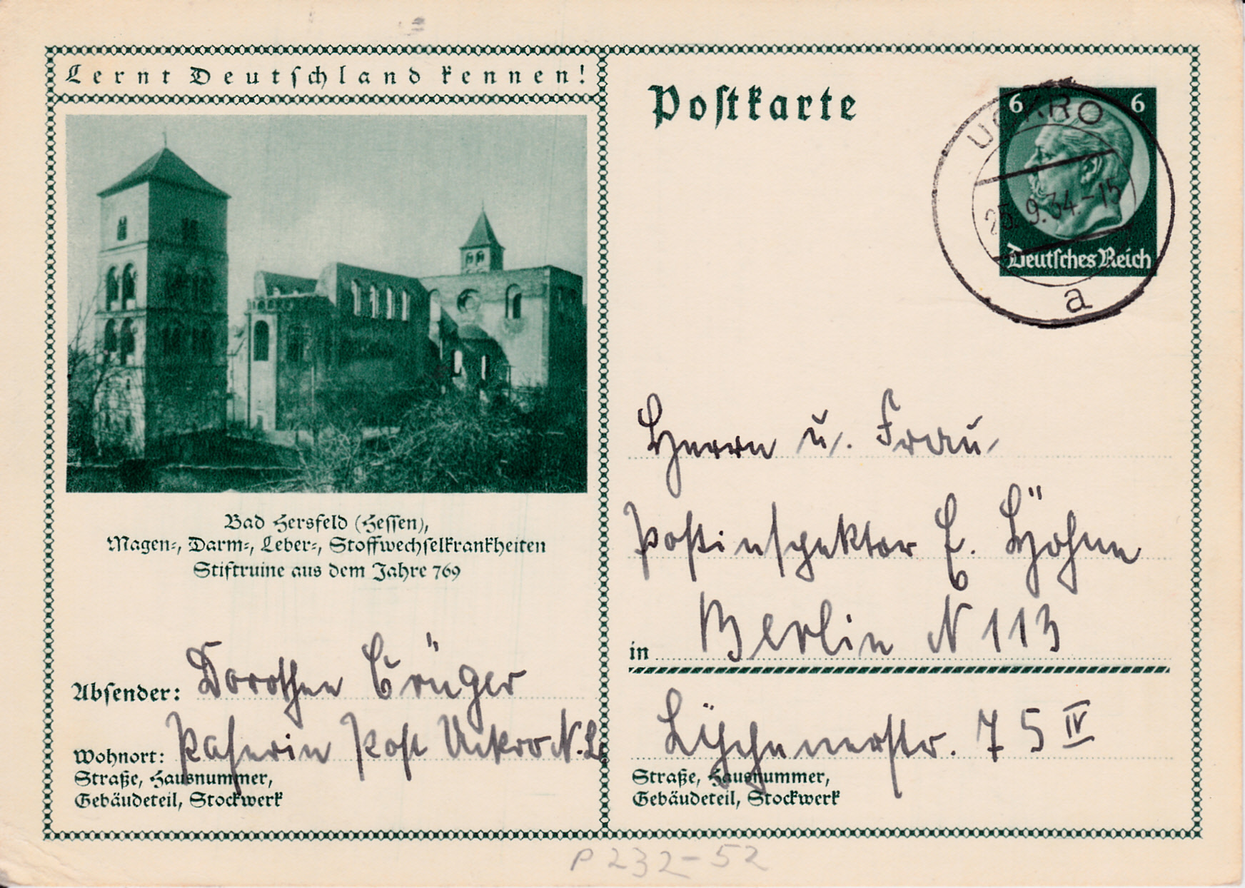 Die Stiftsruine in Bad Hersfeld (Hessen) zeigt uns diese Bildpostkarte (MiNr P 232/52).