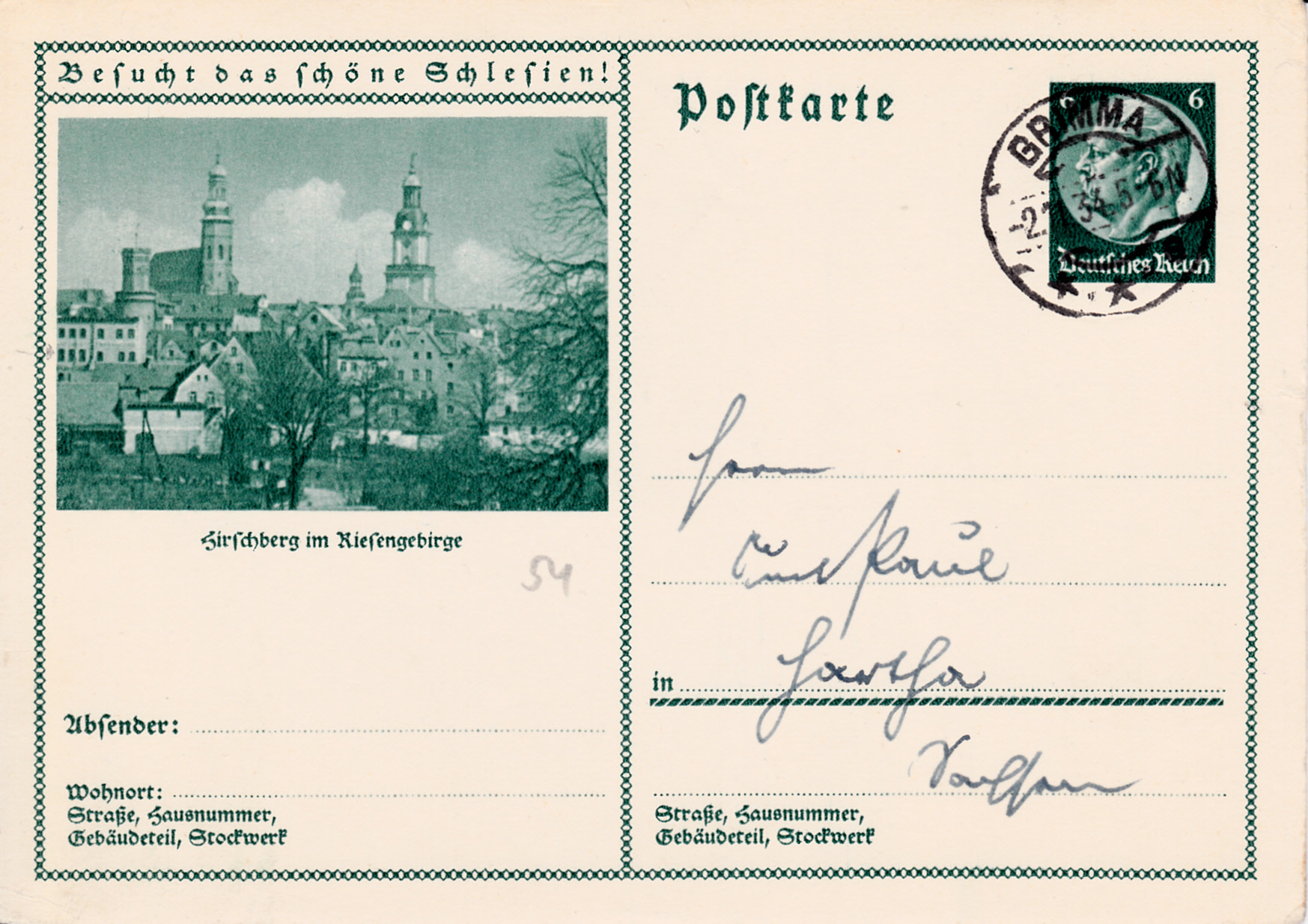 Hirschberg im Riesengebirge wirbt mit dieser Karte (MiNr P 232/54) für einen Besuch in Schlesien. Hirschberg im Riesengebirge heißt heute Jelenia Góra und ist eine Stadt in der polnischen Woiwodschaft Niederschlesien.