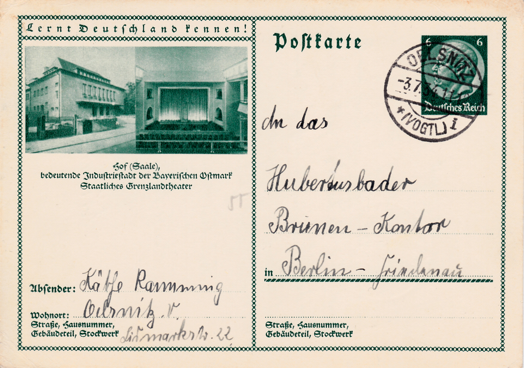 Hof an der Saale zeigt auf dieser Karte (MiNr P 232/55) das Grenzlandtheater von außen und innen.