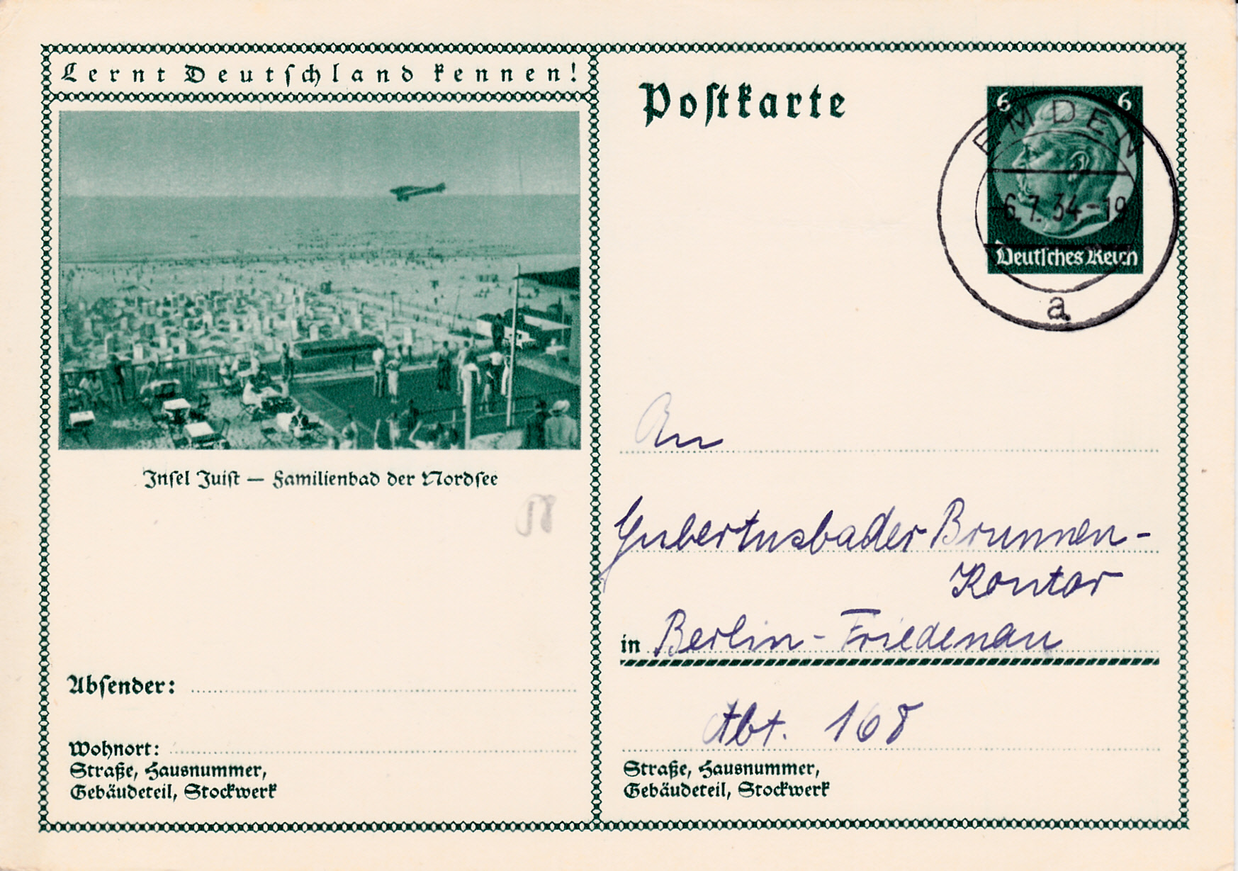 Für die Insel Juist ist auf dieser Bildpostkarte (MiNr P 232/58) ein Foto eines Strandabschnitts abgebildet.