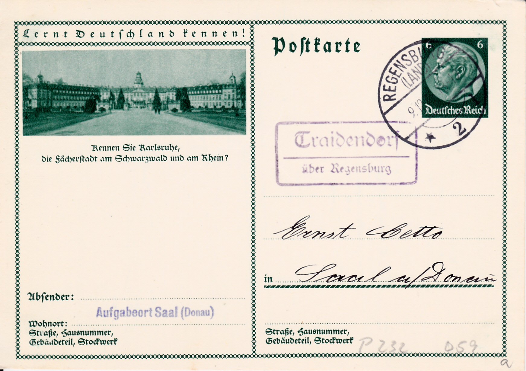 Auf einer weiteren Karte (MiNr P 232/59) für Karlsruhe wird wieder das Karlsruher Schloss gezeigt.