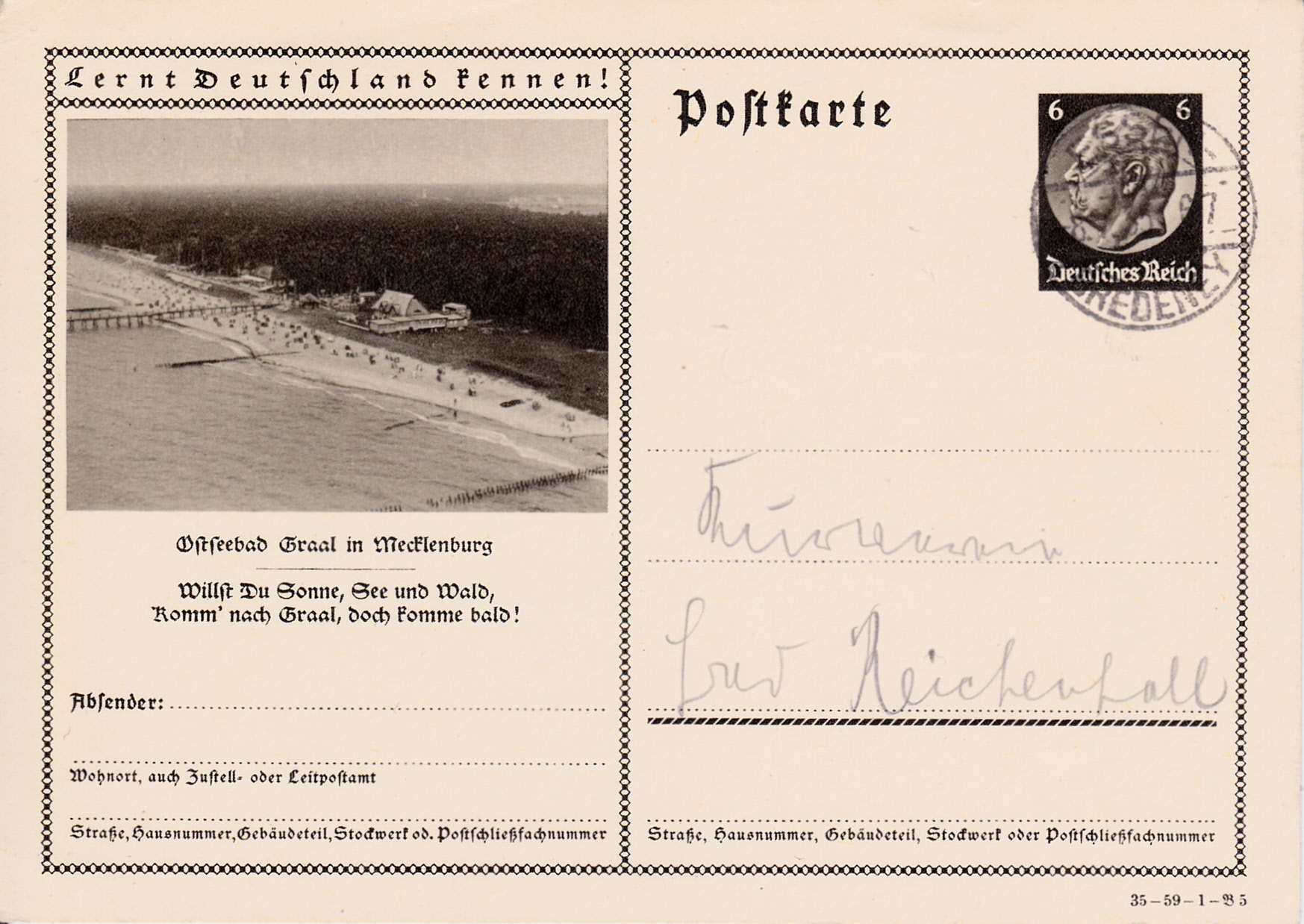Das Ostseebad Graal wirbt auf dieser Karte (Serie 59 Bild 5) mit einer Strandansicht für einen baldigen Besuch.