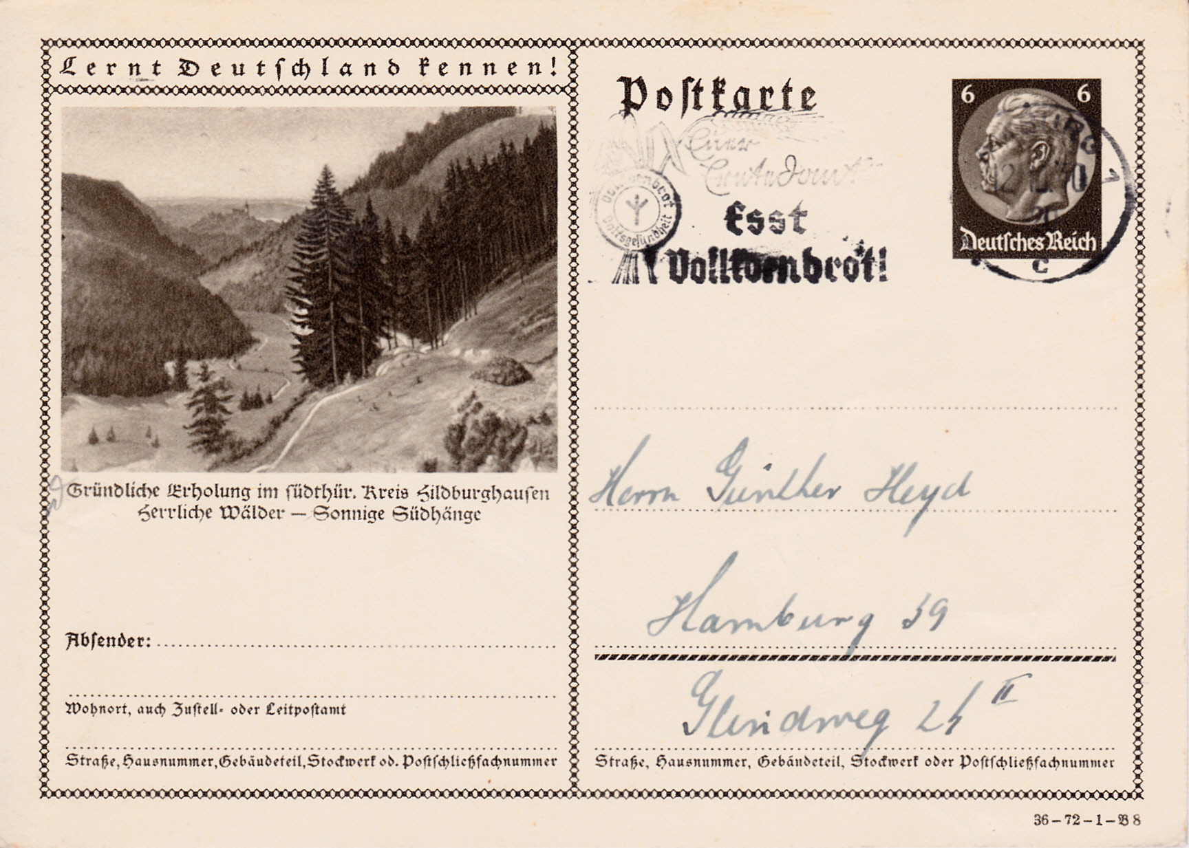 Hildburghausen stellt auf dieser Karte (Serie 72 Bild 8) eine Landschaft aus dem Thüringer Wald vor, um für Erholungsaufenthalte im Kreis Hildburghausen zu werben.