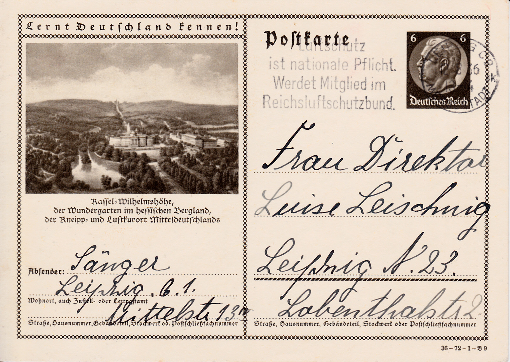 Auf dieser Karte (Serie 72 Bild 9) zeugt Kassel erneut das Foto mit der Wilhelmshöhe, das schon auf der Bildpostkarte 1932 (MiNr P 202/26) zu sehen war.