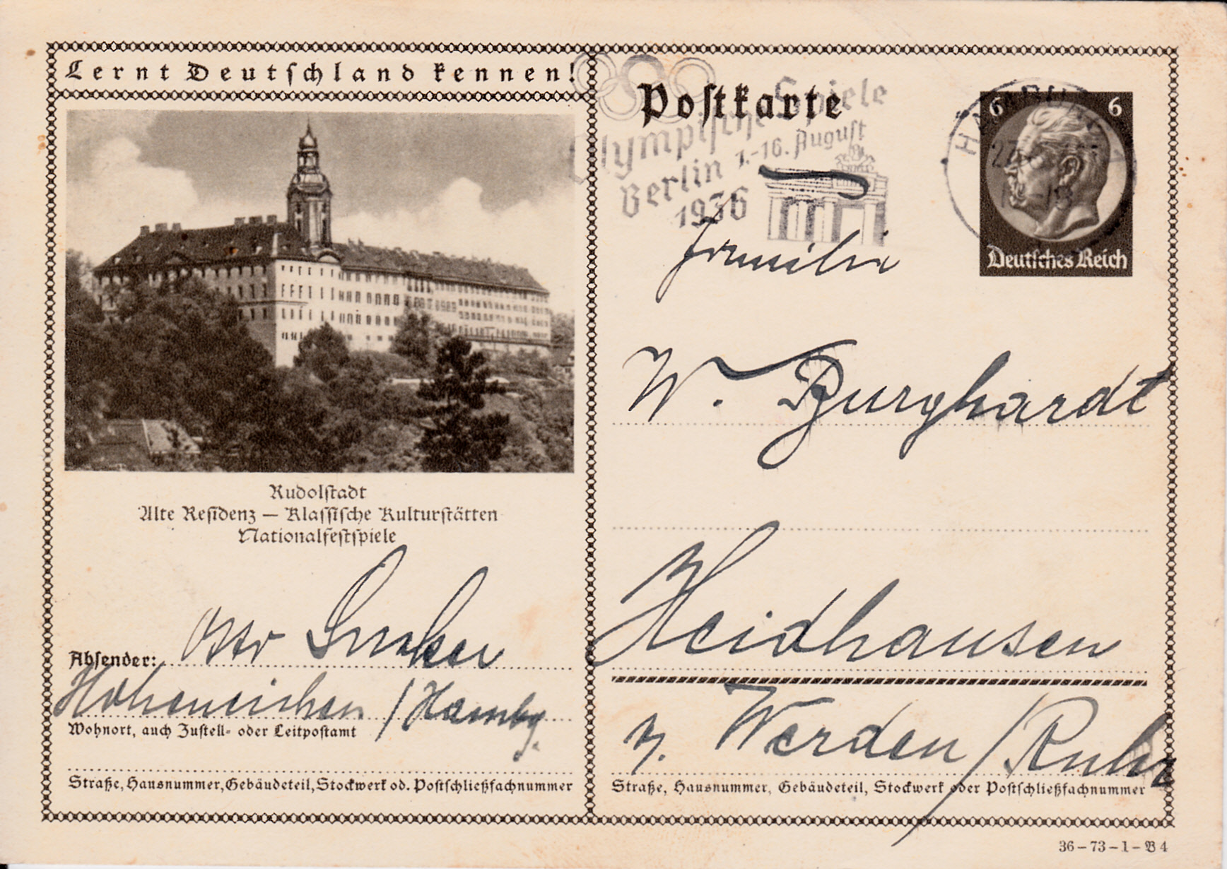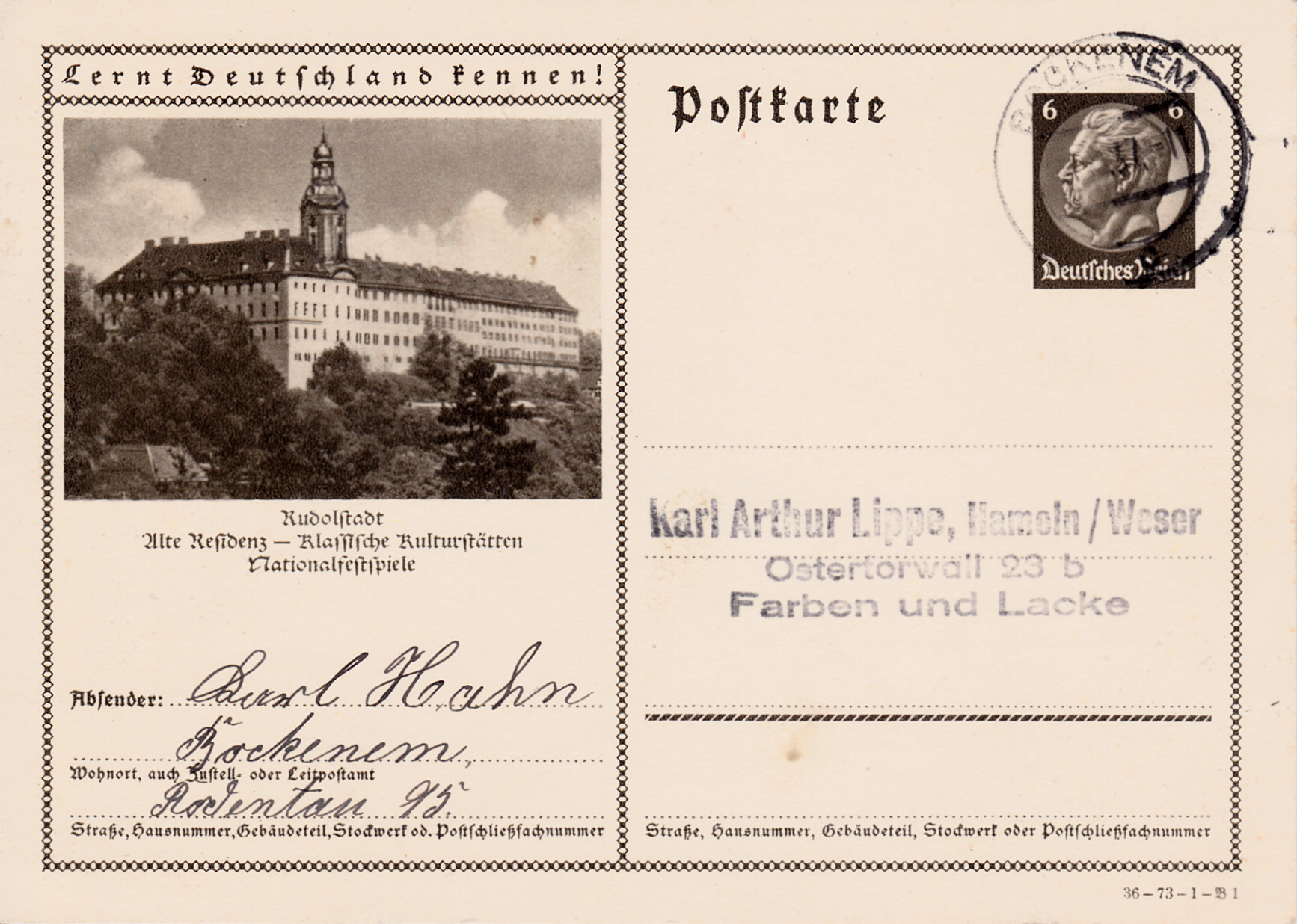Die Bildpostkarte mit dem ehemaligen Residenzschloss in Rudolstadt gibt es auch noch mit einem anderen Druckvermerk (Serie 73 Bild 4)
