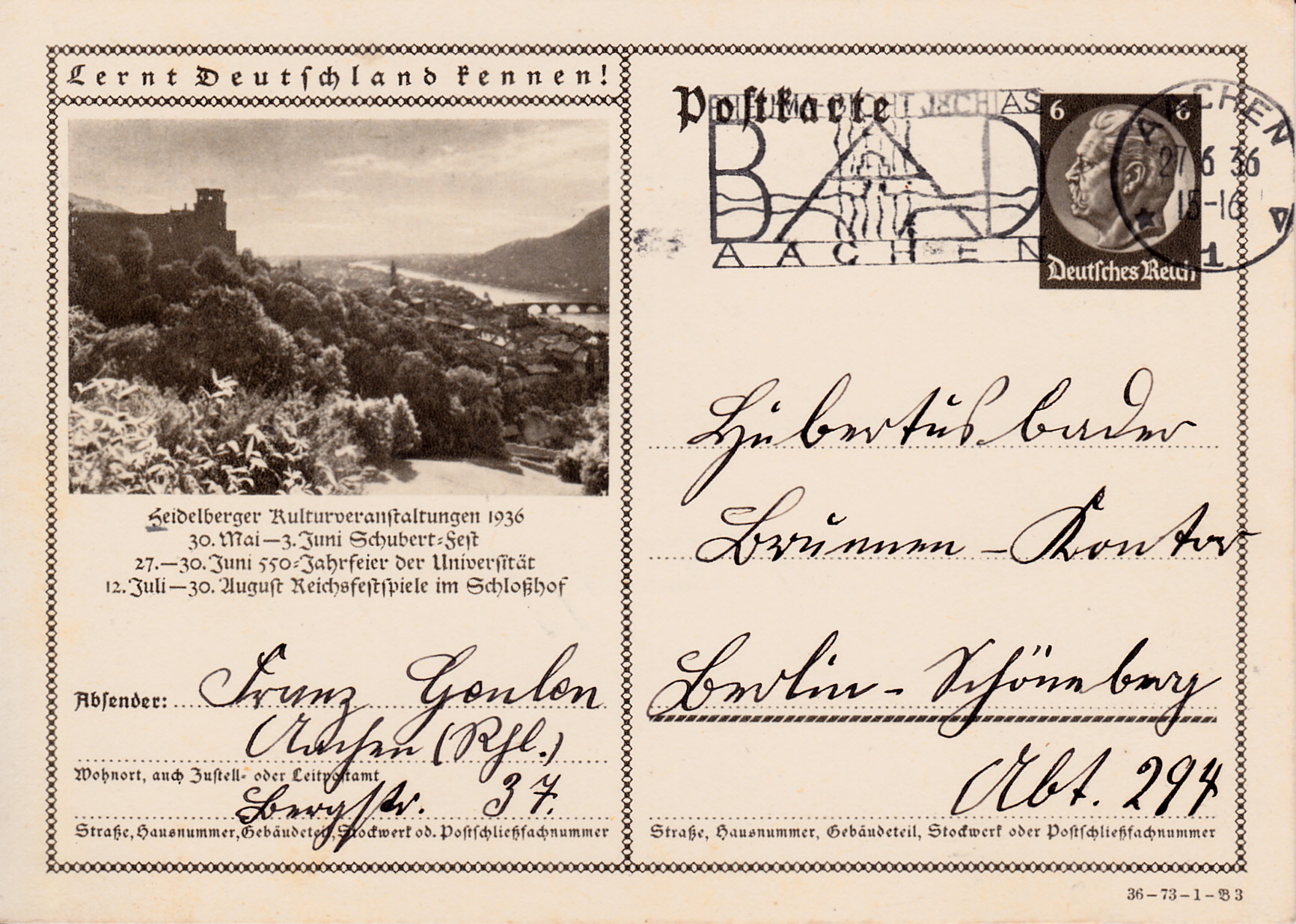 Das Heidelberger Schloss ist das Wahrzeichen der Stadt Heidelberg. Bis zu seiner Zerstörung im Pfälzischen Erbfolgekrieg war es die Residenz der Kurfürsten von der Pfalz. Auf eine Karte aus dem Jahre 1936 (Serie 73 Bild 3) sehen wir das Heidelberger Schloss und das Neckartal in Heidelberg. Es wird auch für die Kulturveranstaltungen im Schloss geworben.