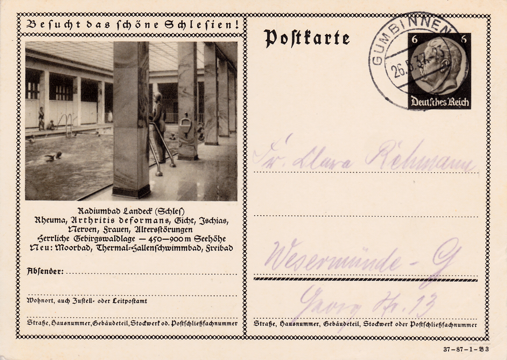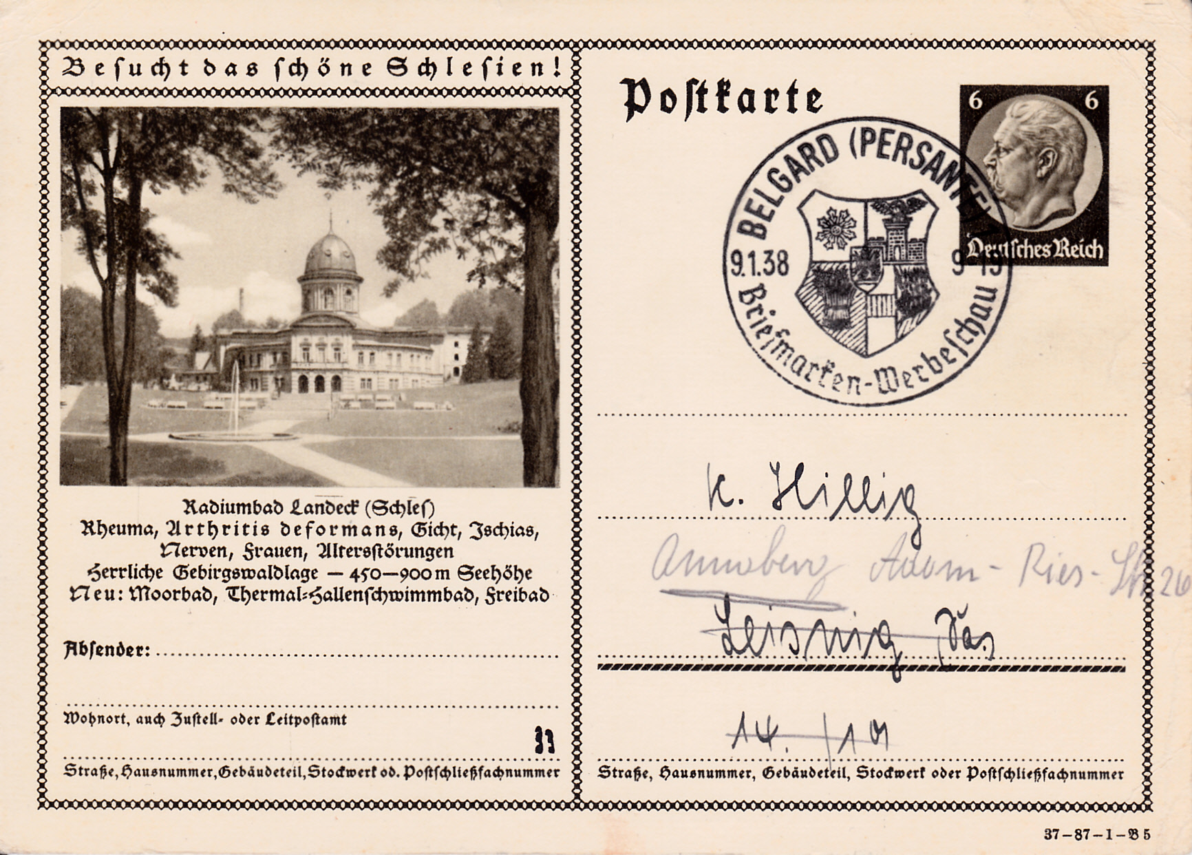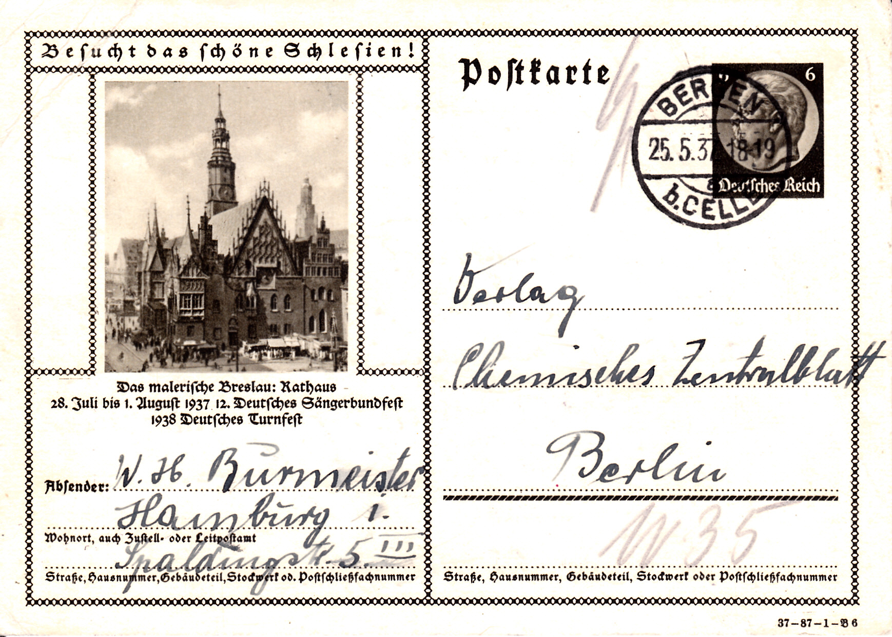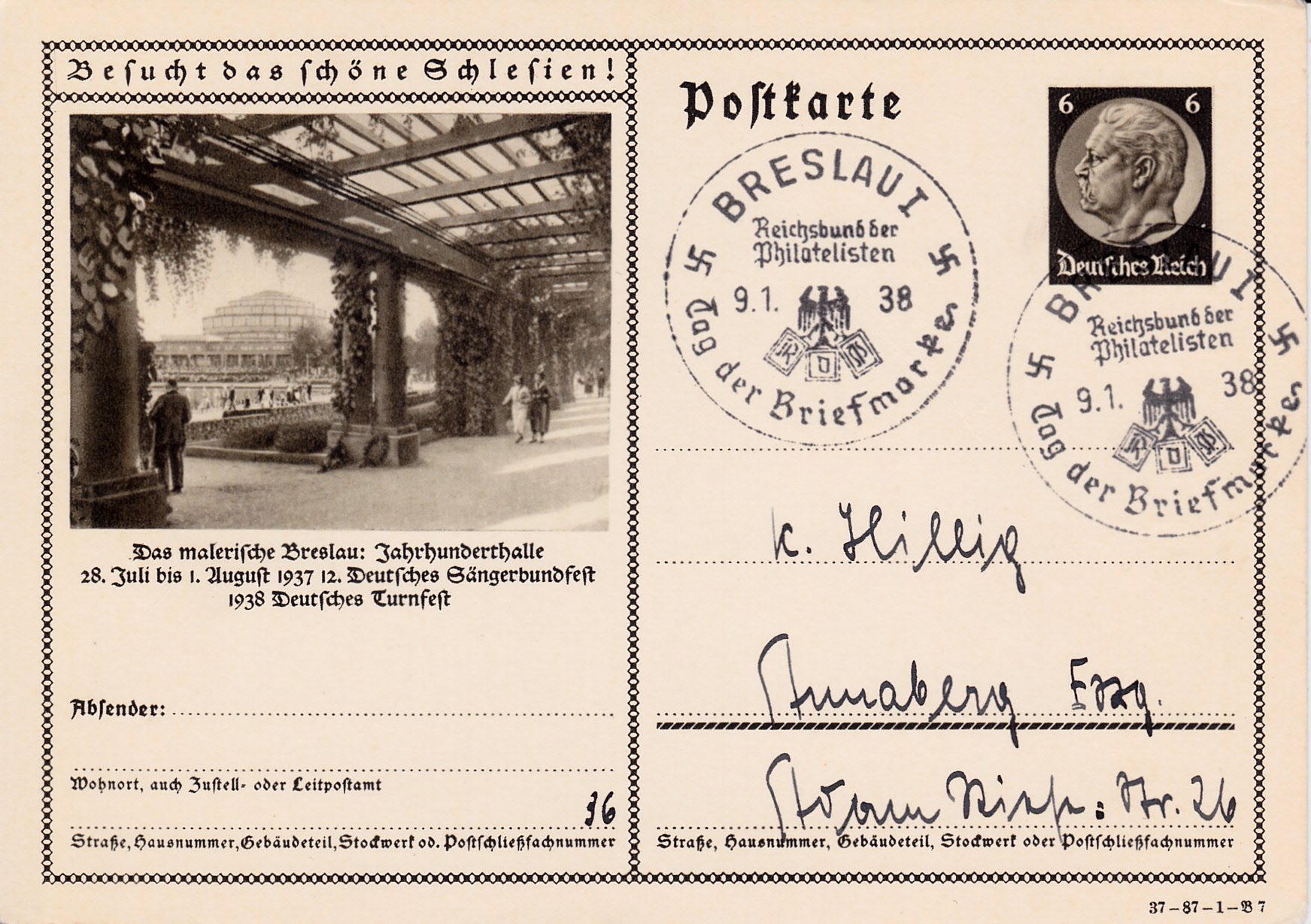 Auch mit der Breslauer Jahrhunderthalle wirbt Breslau auf dieser Karte (Serie 87 Bild 7) für das 12. Deutsche Sängerbundfest 1937 und das Deutsche Turnfest 1938, die beide in Breslau stattfanden. Die Karte ist in Breslau mit einem Sonderstempel gestempelt worden.