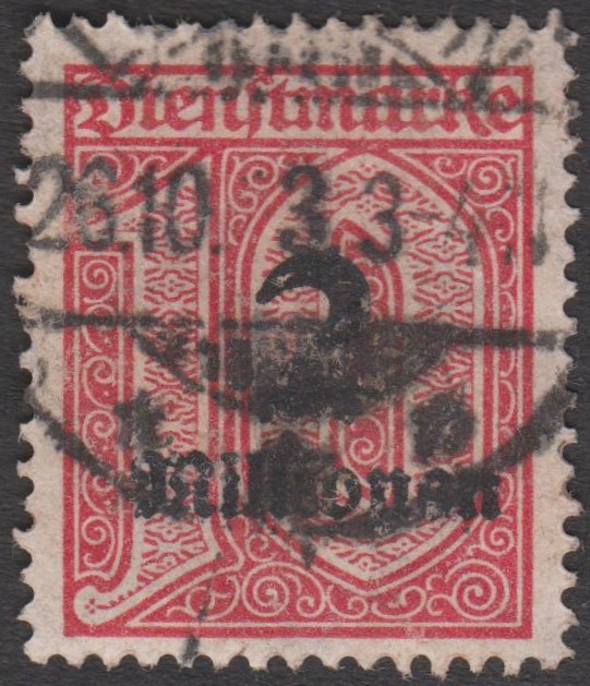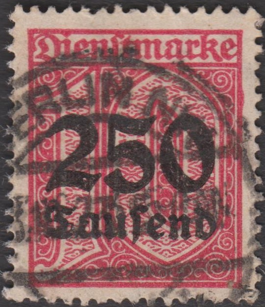 Diese Dienstmarke erschien am 01.12.1923, indem Deutsches Reich MiNr. 340 a mit einem schwarzen, schlangenförmigen Buchdruck-Aufdruck "Dienstmarke" versehen wurde. Stark verschobene Wertangaben sind Passerverschiebungen, also Druckzufälligkeiten, die nicht extra katalogisiert und bewertet werden , aber selbstverständlich trotzdem sammelwürdig sind!