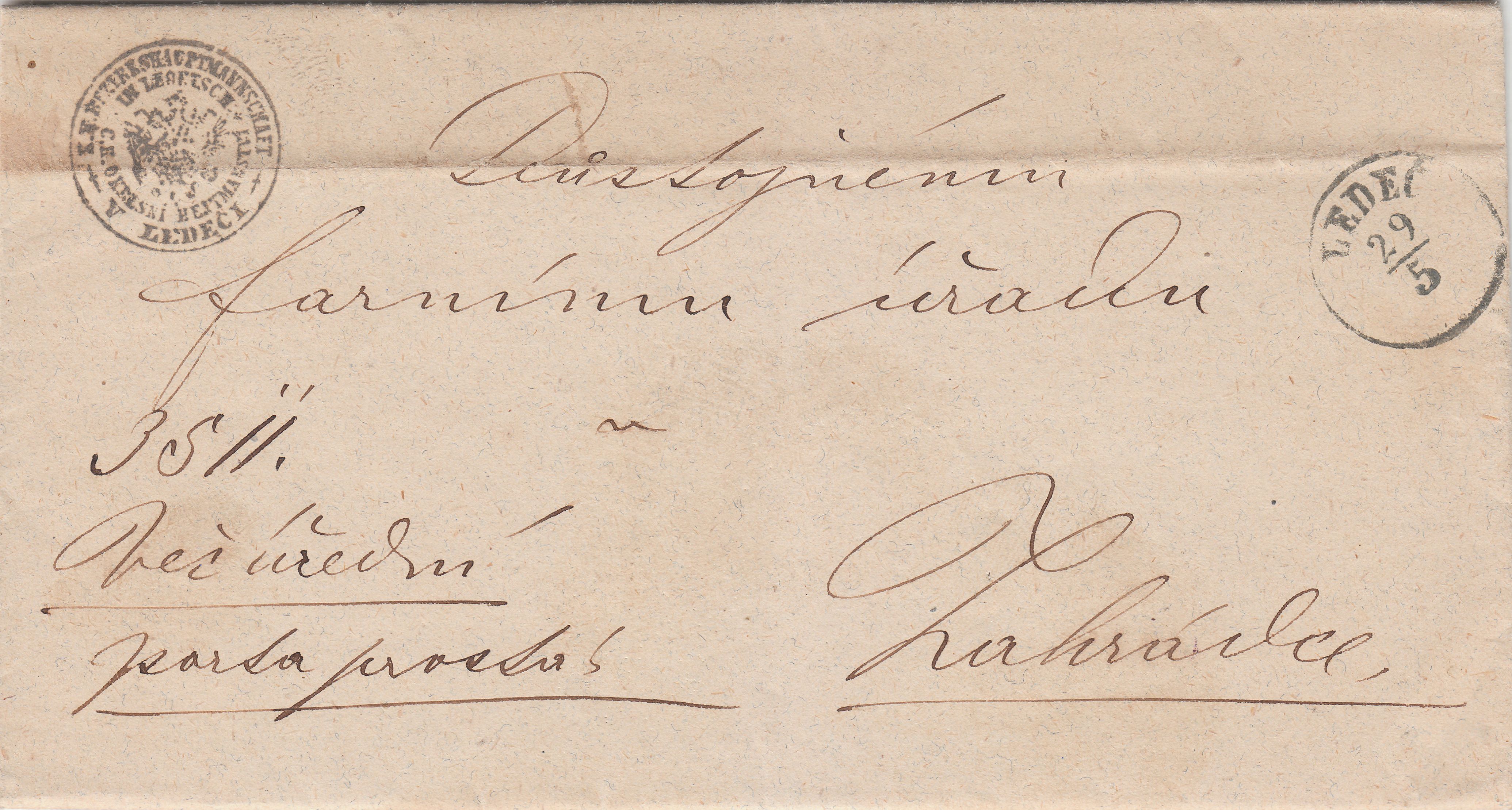 Dieser Faltbrief mit Absenderstempel "K. K. BEZIRKSHAUPTMNNSCHAFT IN LEDETSCH" wurde am 29.05.1875, also zur Zeit der Gültigkeit der Brustschildmarken, in Ledeč = Ledetsch aufgegeben: