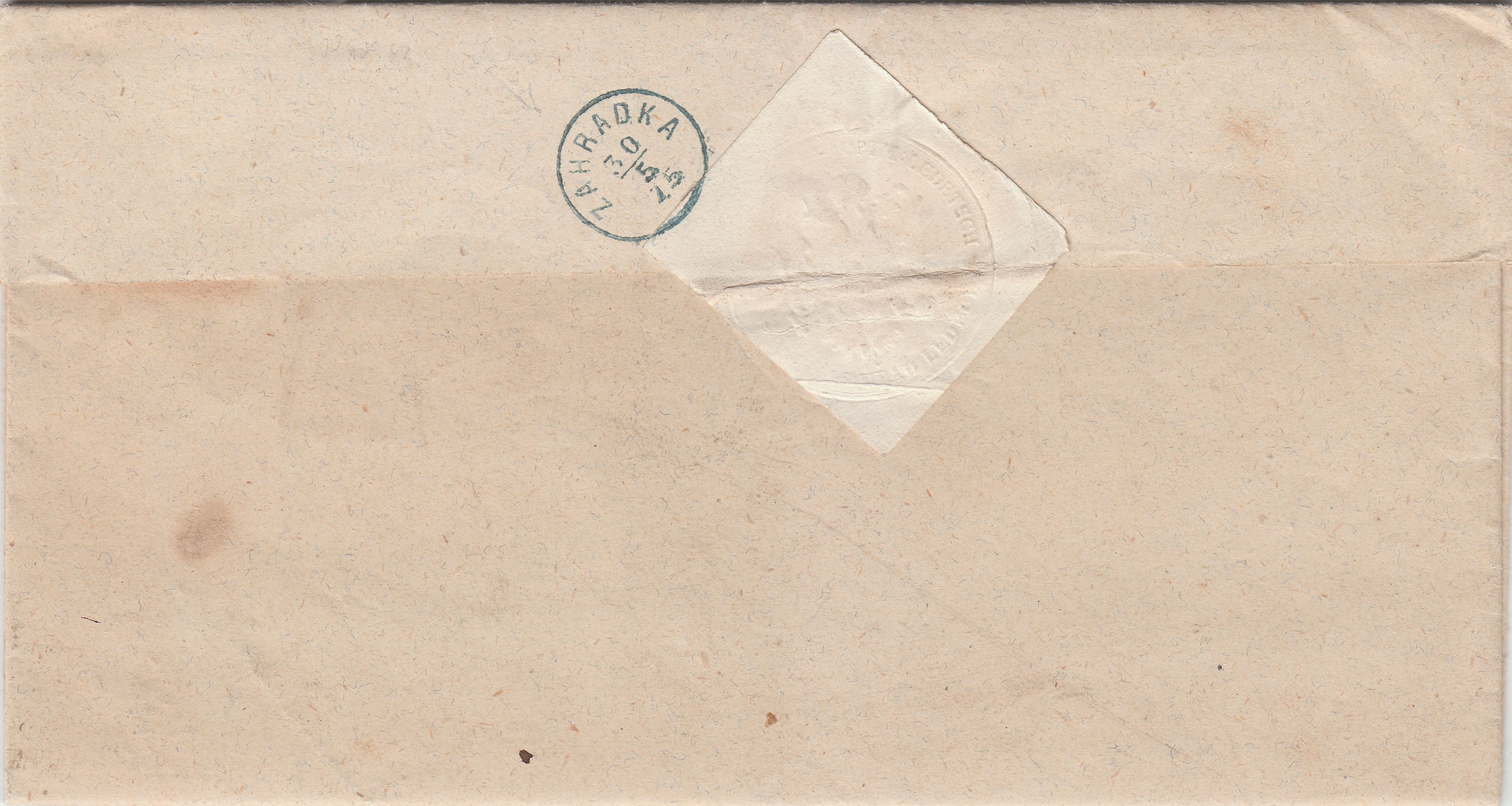 Rückseitig findet sich als Ankunftsstempel ein blauer Fingerhutstempel ZAHRADKA vom 30.05.1875: