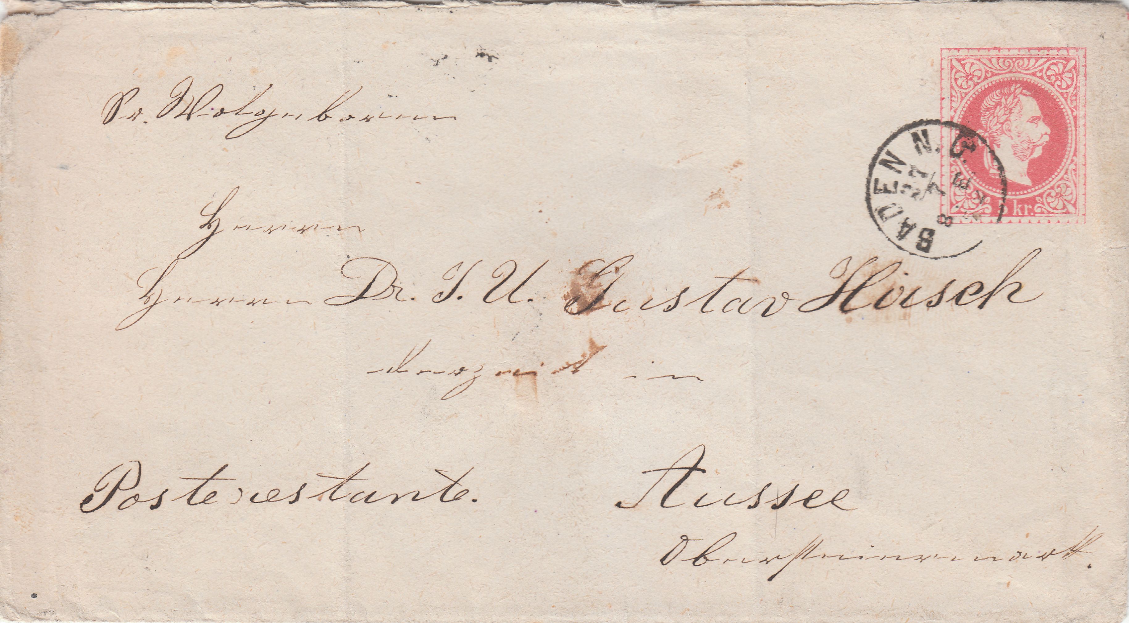 Hier ein am 27.07.1872 in "BADEN N.Ö." (N. Ö. = Niederösterreich) aufgegebener Ganzsachenumschlag, adressiert nach Aussee "Poste restante" (= postlagernd):