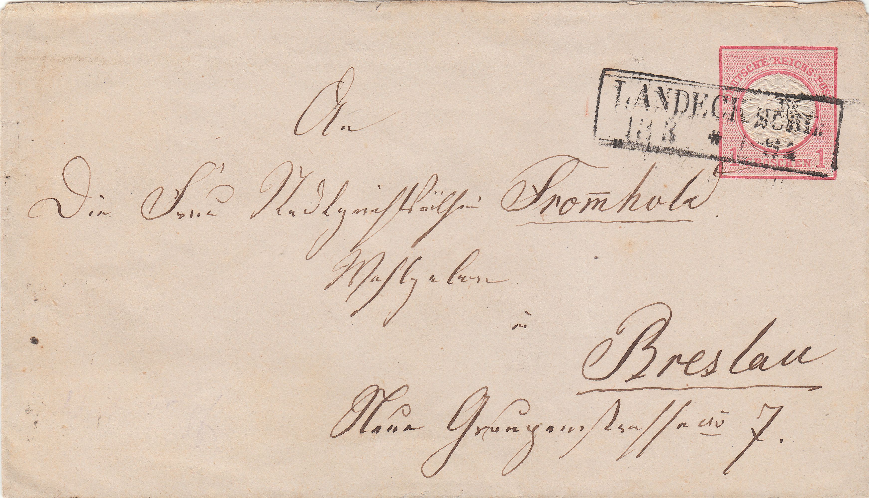 Ganzsachenumschlag MiNr. U5 A, entwertet am 13.03.1874 per nachverwendetem, preussischem, zweizeiligem Rechteckstempel "LANDECK IN SCHL: *", Feuser Pr 1814: