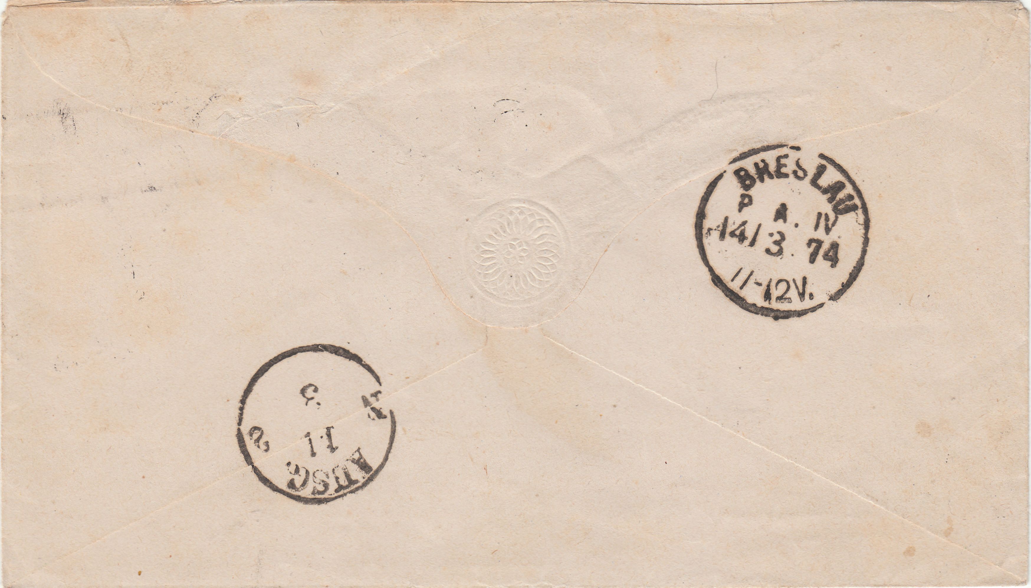 Rückseitig wurde am 14.03.1874 ein Kreisstempel "BRESLAU P. A. IV" abgeschlagen: