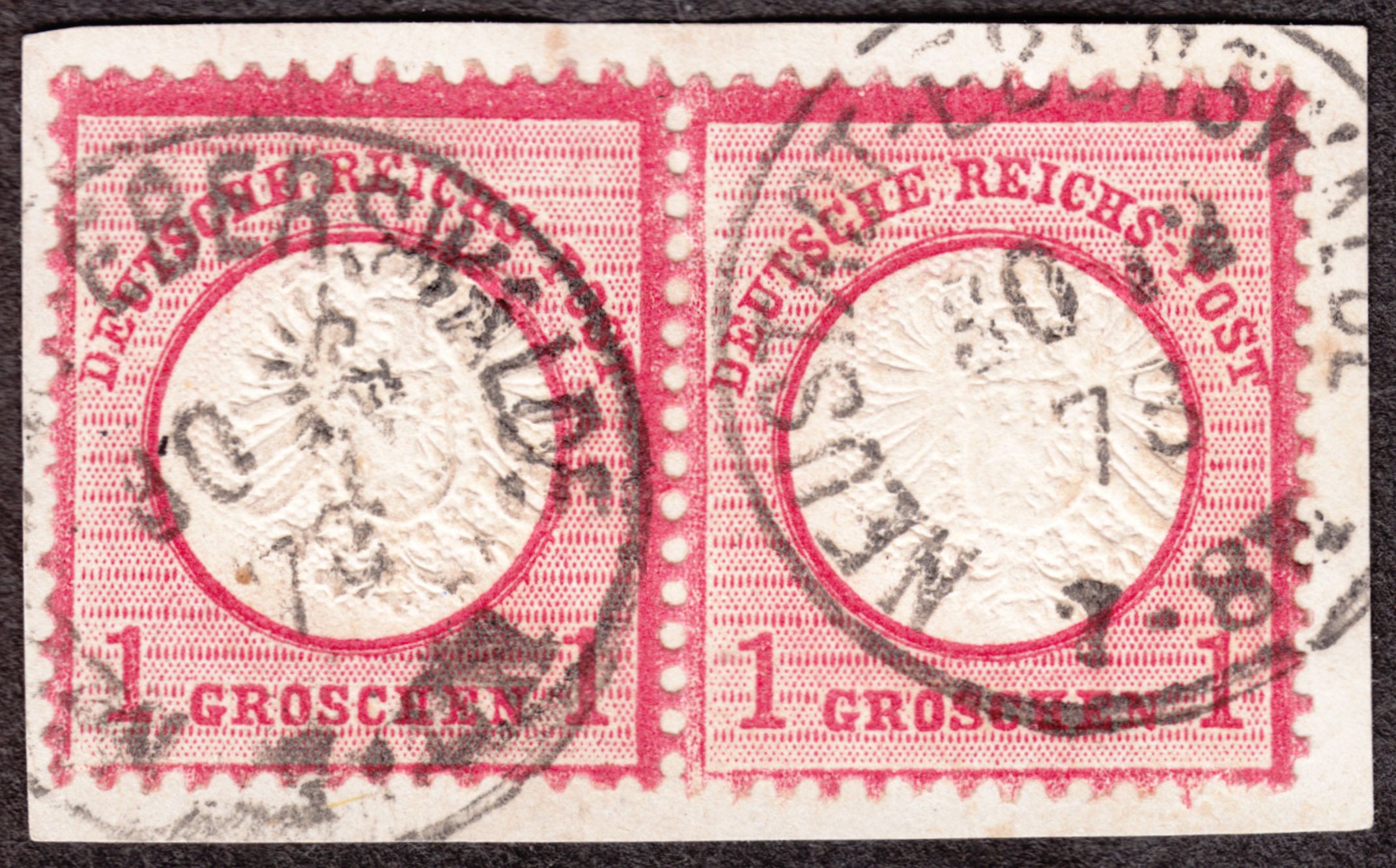 Hier ein Paar der MiNr. 19 mit versetzter Prägung auf Briefstück, entwertet am 30.12.1873 per nachverwendetem, preussischem Kreisstempel "NEUSTADT-EBERSWALDE", Feuser Pr 2335: