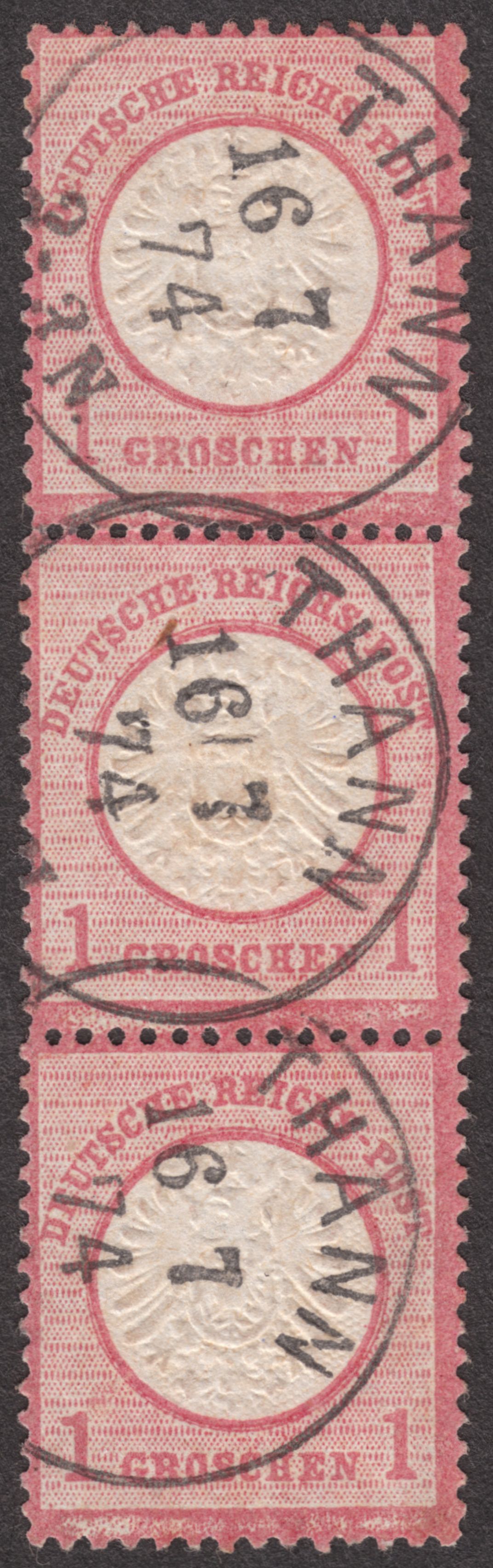 Senkrechter Dreierstreifen der MiNr. 19, entwertet am 16.07.1874 per nachverwendetem NDP-Kreisstempel "THANN":