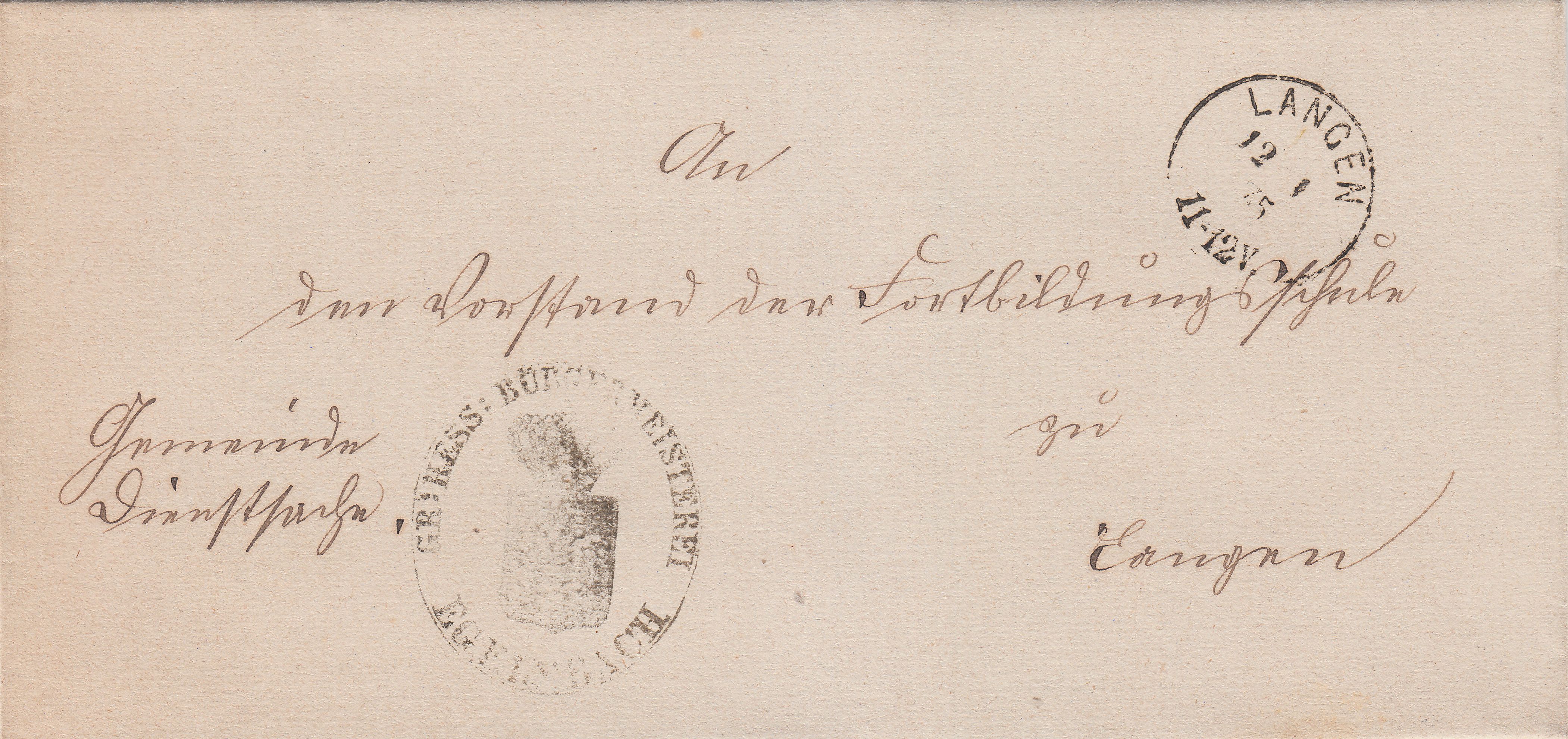 Der Brief trägt einen Rechteckstempel "PD" = Port payé à Destination = Porto zum Bestimmungsort bezahlt.