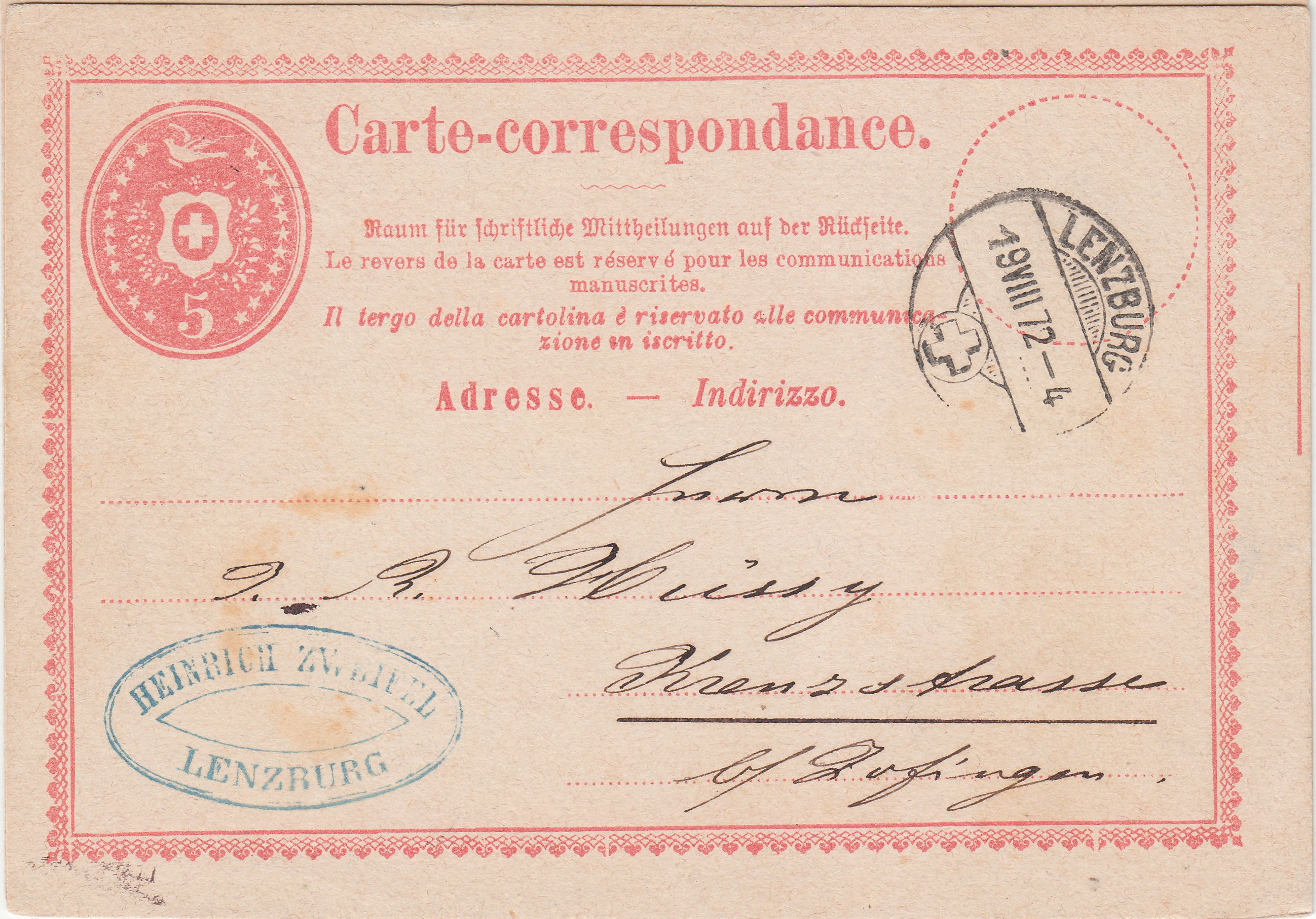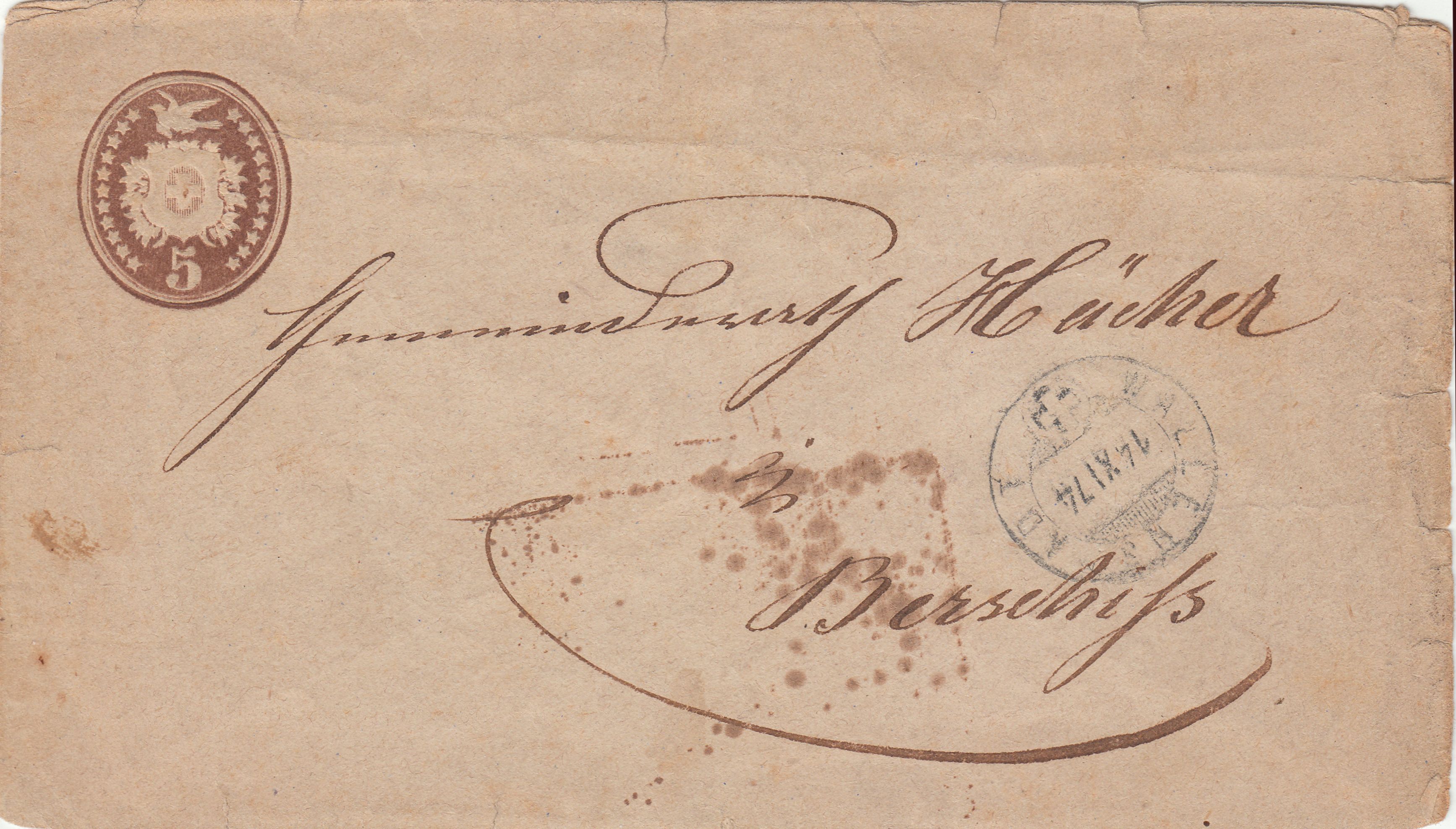 Frisch aus der elektronischen Lagune bei mir eingetroffen ist heute dieser Ganzsachenumschlag aus der Schweiz mit Wertzeicheneindruck Schweizer Wappen zu 5 Rappen im Prägedruck, gebraucht mit einer Zusatzfrankatur von 20 Rappen "Sitzende Helvetia" am 22.06.1872 als Brief nach Hamburg: