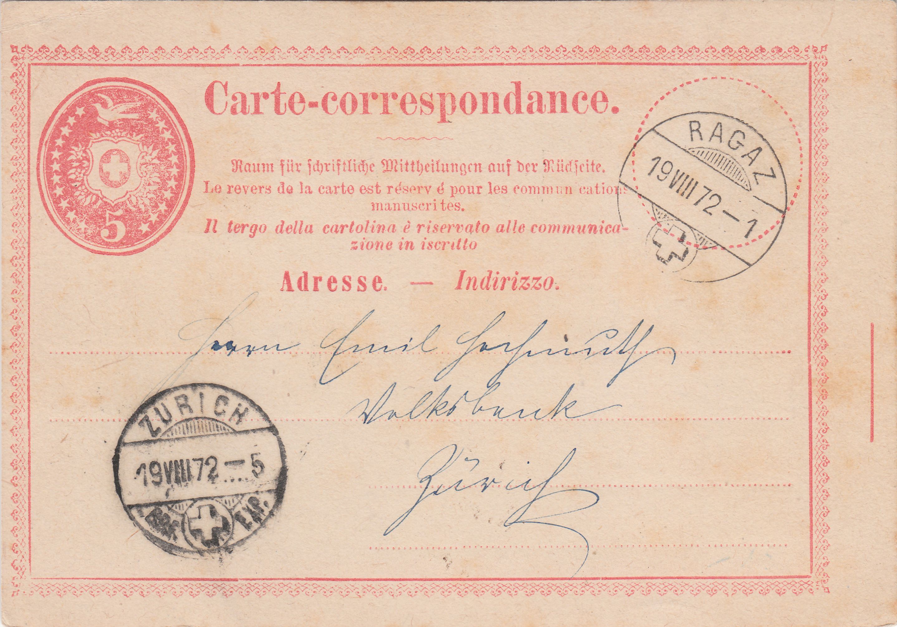 Am 23.06.1872 wurde rückseitig in BASEL ein Tagesstempel als Durchgangsstempel abgeschlagen und am 25.06.1872 ein Tagesstempel von HAMBURG (Jahreszahl quer hinter dem Ortsnamen, Uhrzeit über dem Datum) als Ankunftstempel.