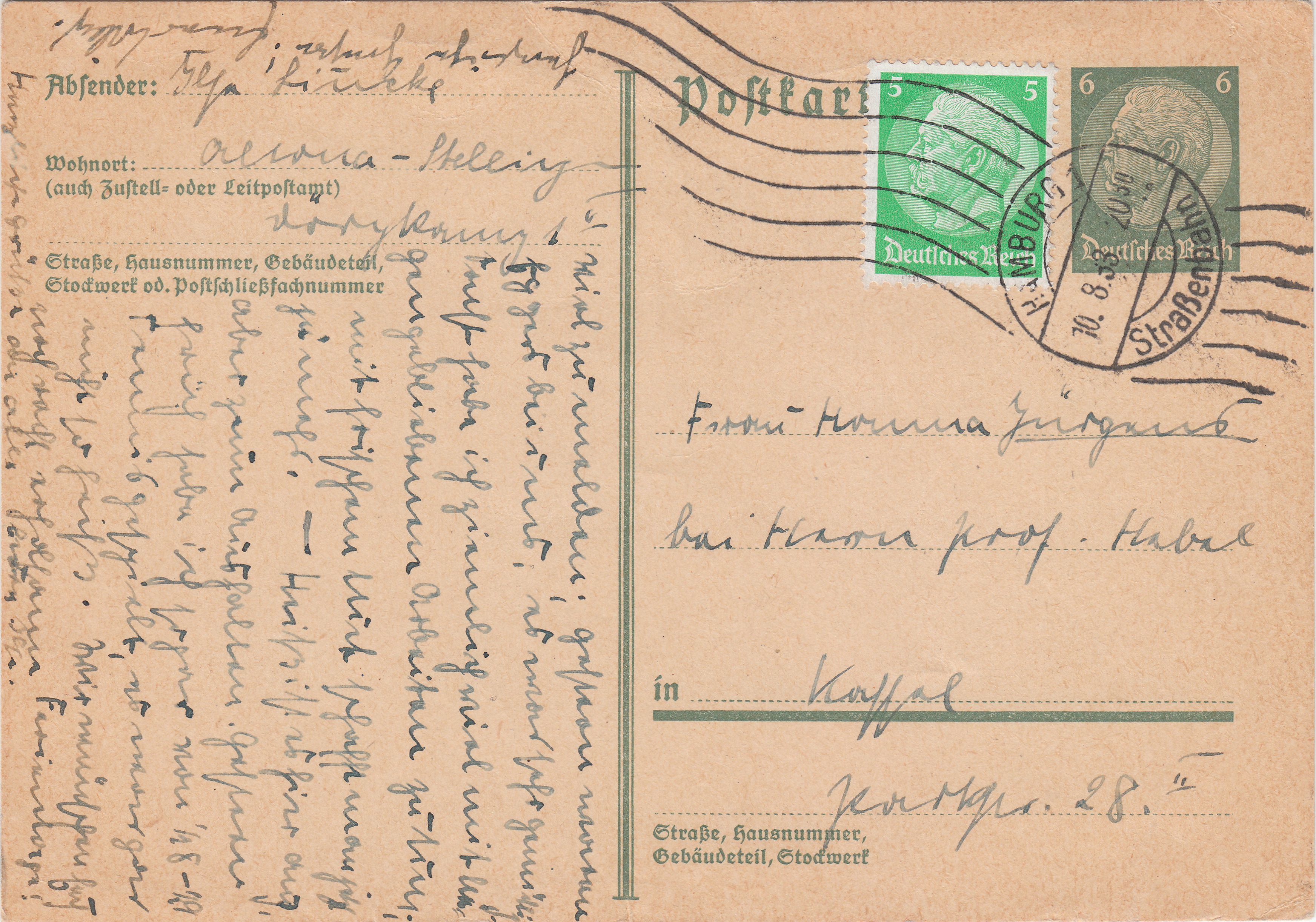 Sehr selten ist die Portostufe zu 11 Pfennig, einer Postkarte im Fernverkehr (6 Pfennig) per Aufgabe in den Straßenbahn-Briefkasten in Hamburg (5 Pfennig) entsprechend, hier vom 10.08.1933: