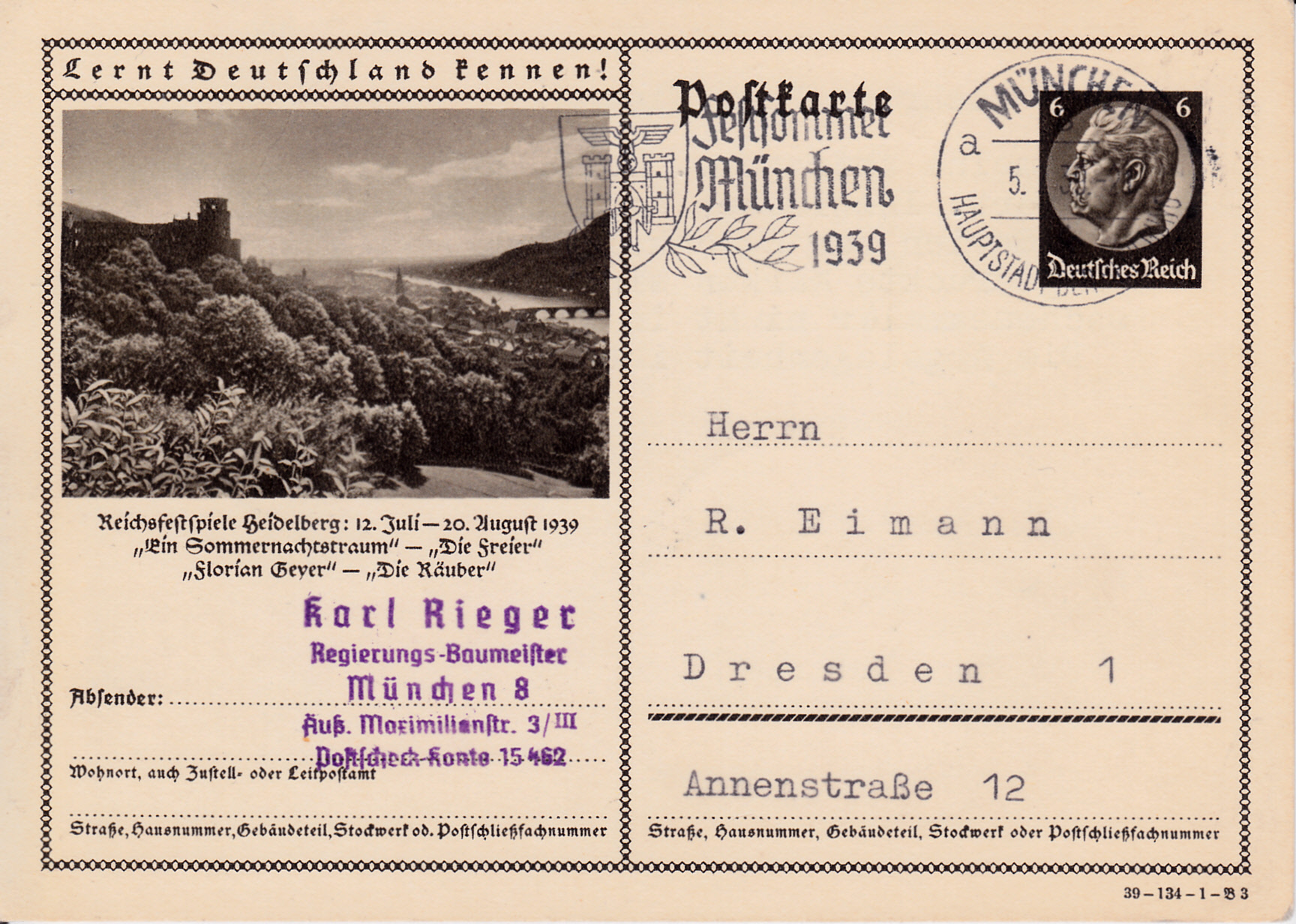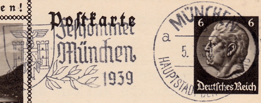 Maschinenwerbestempel München 8 Hauptstadt der Bewegung Kennbuchstabe "a" vom 5.??.1939 mit dem Werbeeinsatz "Festsommer München 1939" auf einer Bildpostkarte.