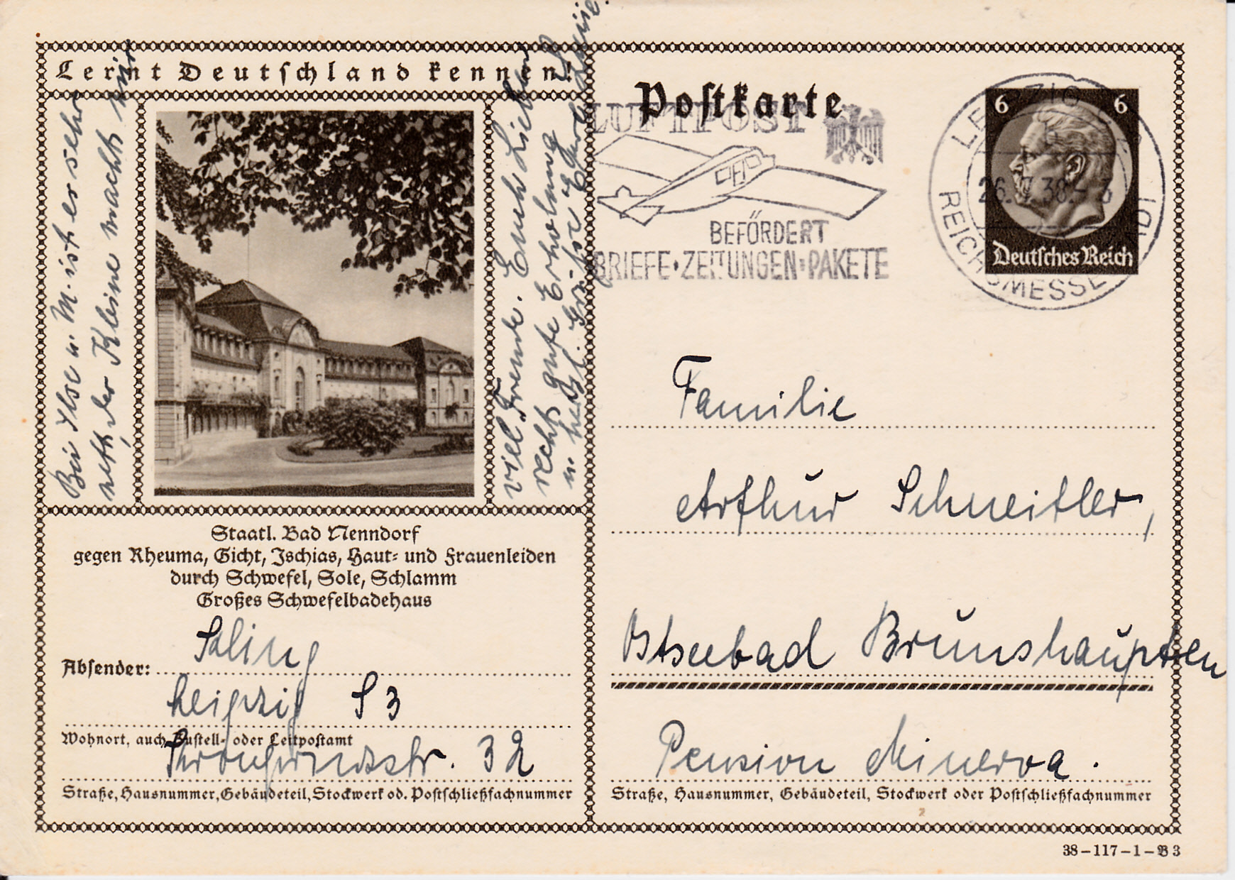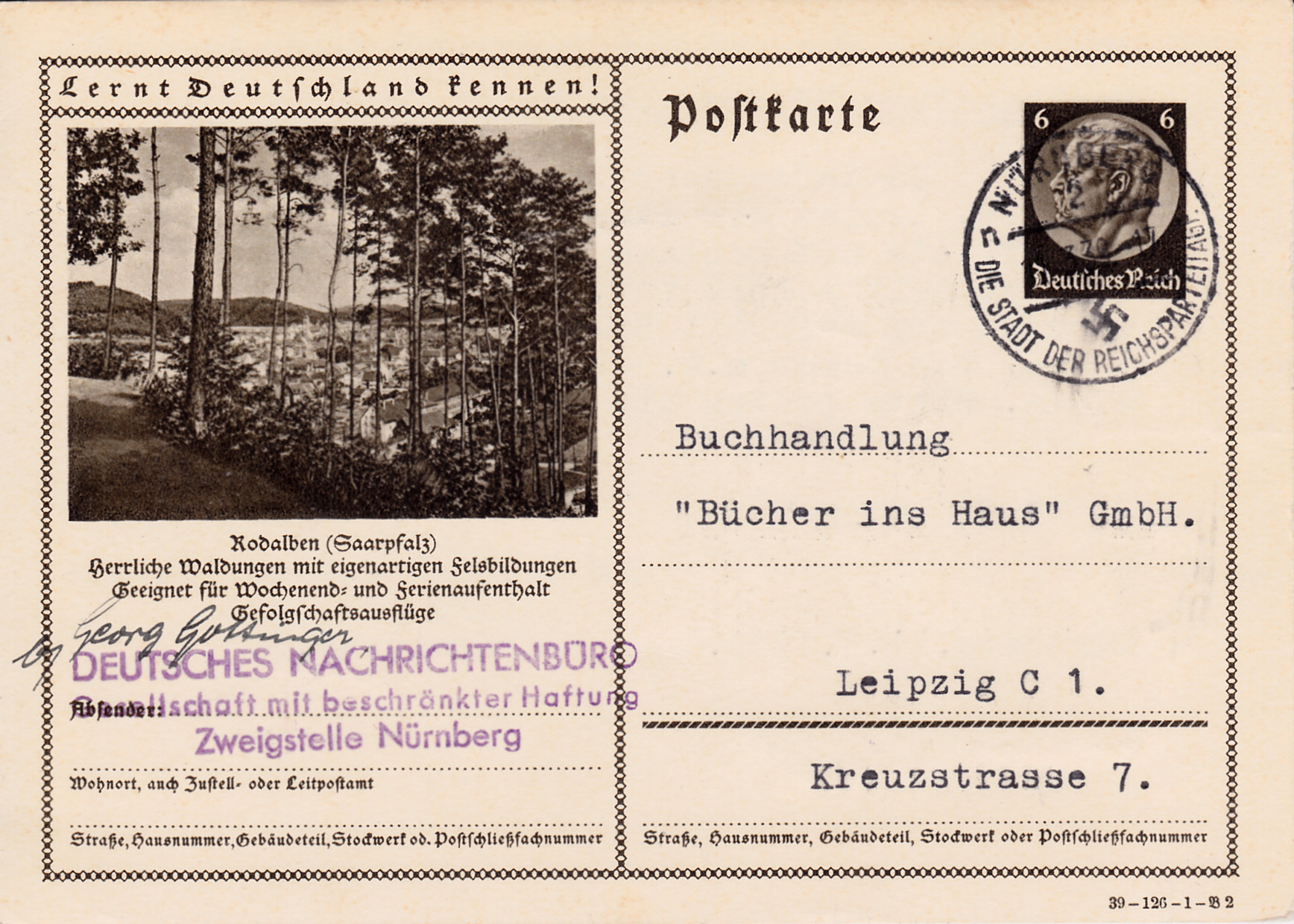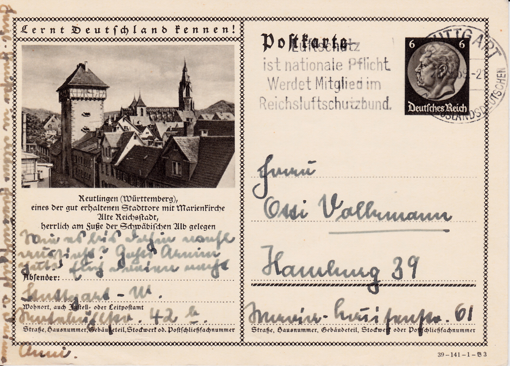 Diese Bildpostkarte wurde mit dem Maschinenstempel "STUTTGART 9 e Stadt der Auslandsdeutschen" mit dem Text "Luftschutz ist nationale Pflicht Werdet Mitglied im Reichsluftschutzbund" gestempelt.